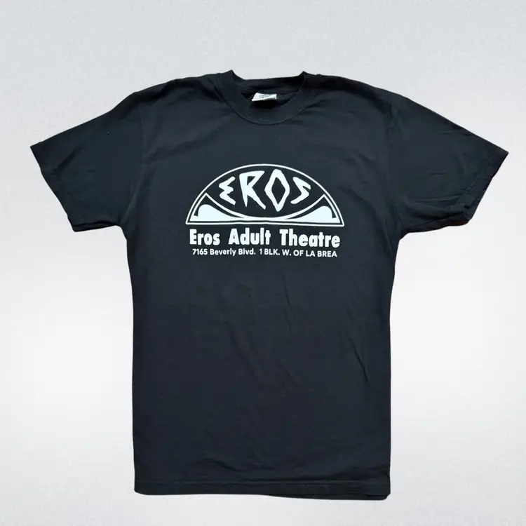 Throwback design to what the New Beverly was before it came into existence! The New Beverly is celebrating the Eros Theatre with their February calendar, so we have a t-shirt available now! When Sharon Tate says in "Once Upon a Time in...Hollywood", "What's happening at the dirty movie place?", she is referring to the Eros Theatre!