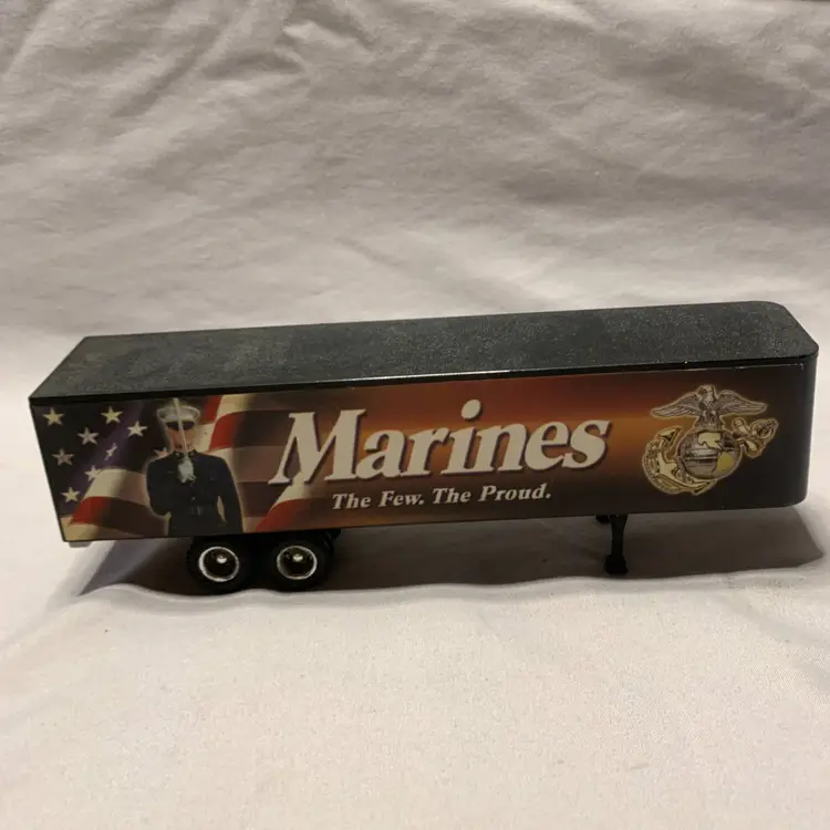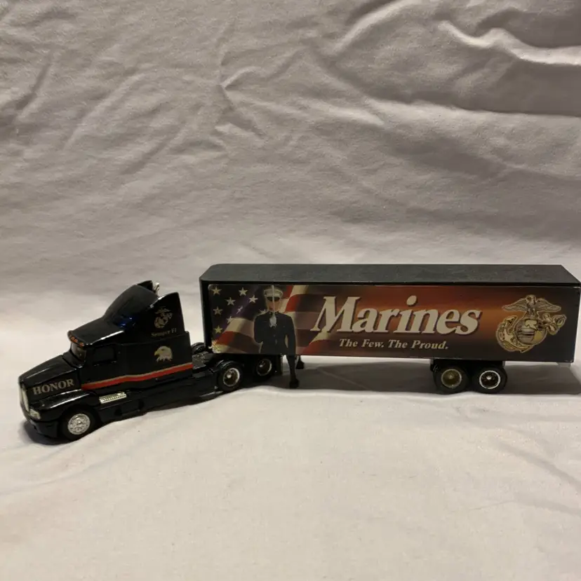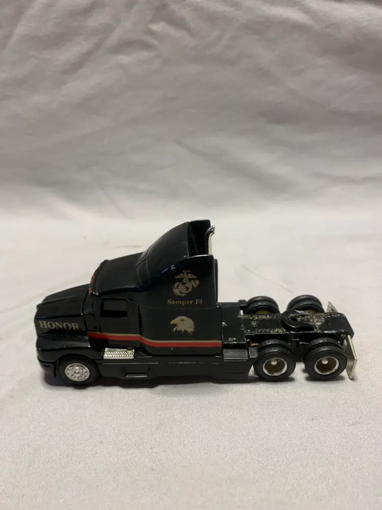 The Ertl Marines Kenworth T600B Tractor Trailer in 1:64 scale is a diecast toy vehicle that features a black color and the iconic Kenworth design. This toy represents a realistic portrayal of a tractor trailer, perfect for collectors or children who enjoy playing with toy trucks. With its detailed design and semper fi theme, this Ertl toy is sure to be a popular choice for fans of military vehicles and truck enthusiasts alike.