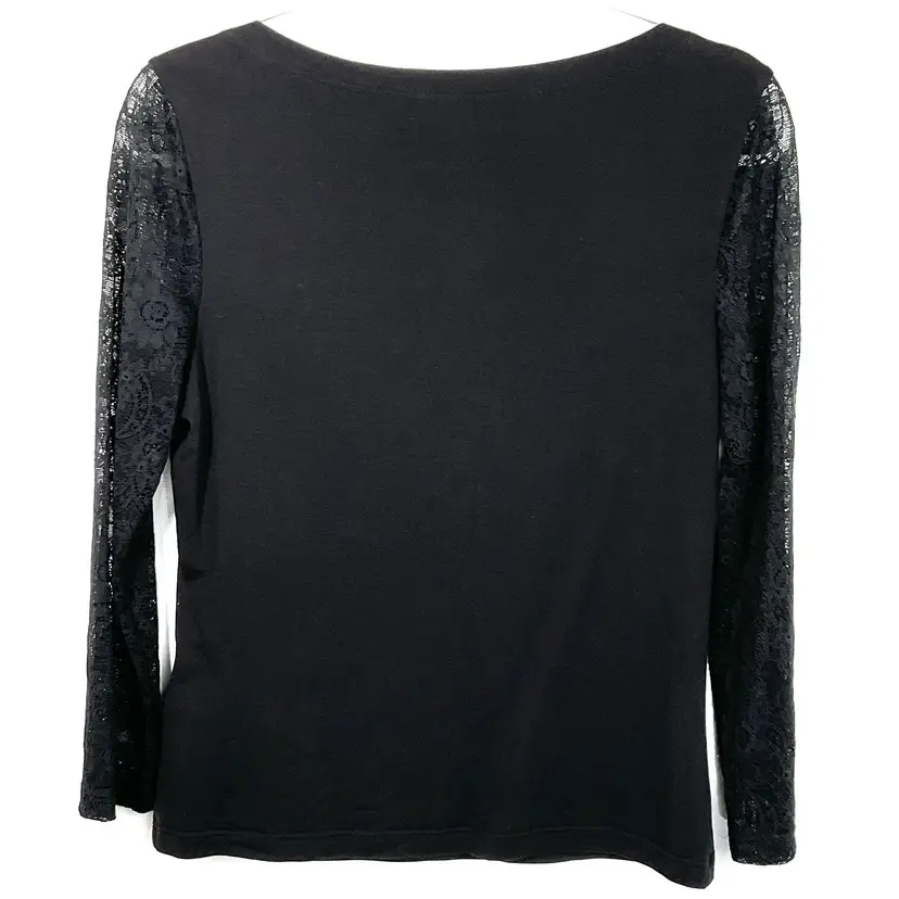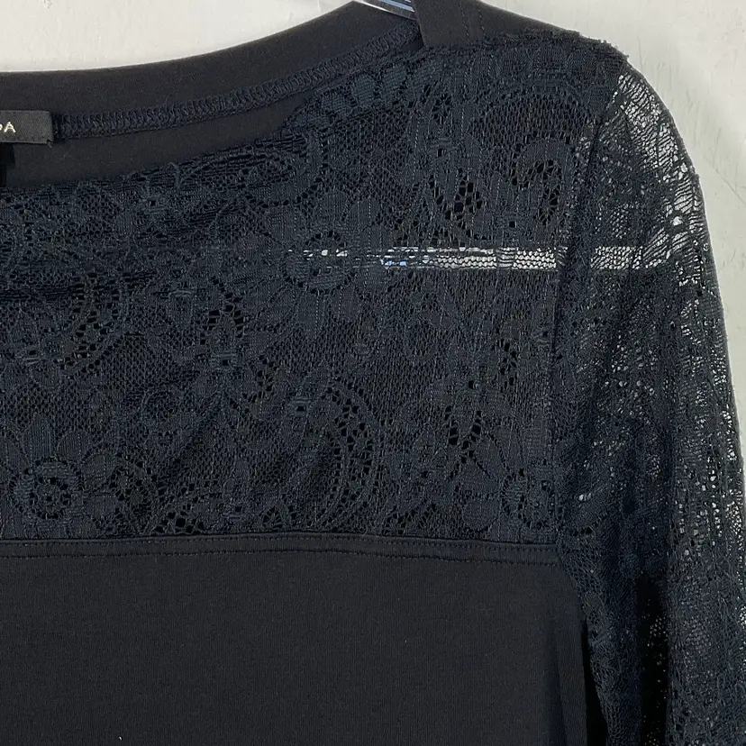 EU size 38, medium Black, shows slight fading Mixed media, with lace on the front upper chest and sleeves Boatneck, long sleeves The tag us detached on one side Total length 22 1/2” Armpit to armpit 18” Lightweight, stretchy