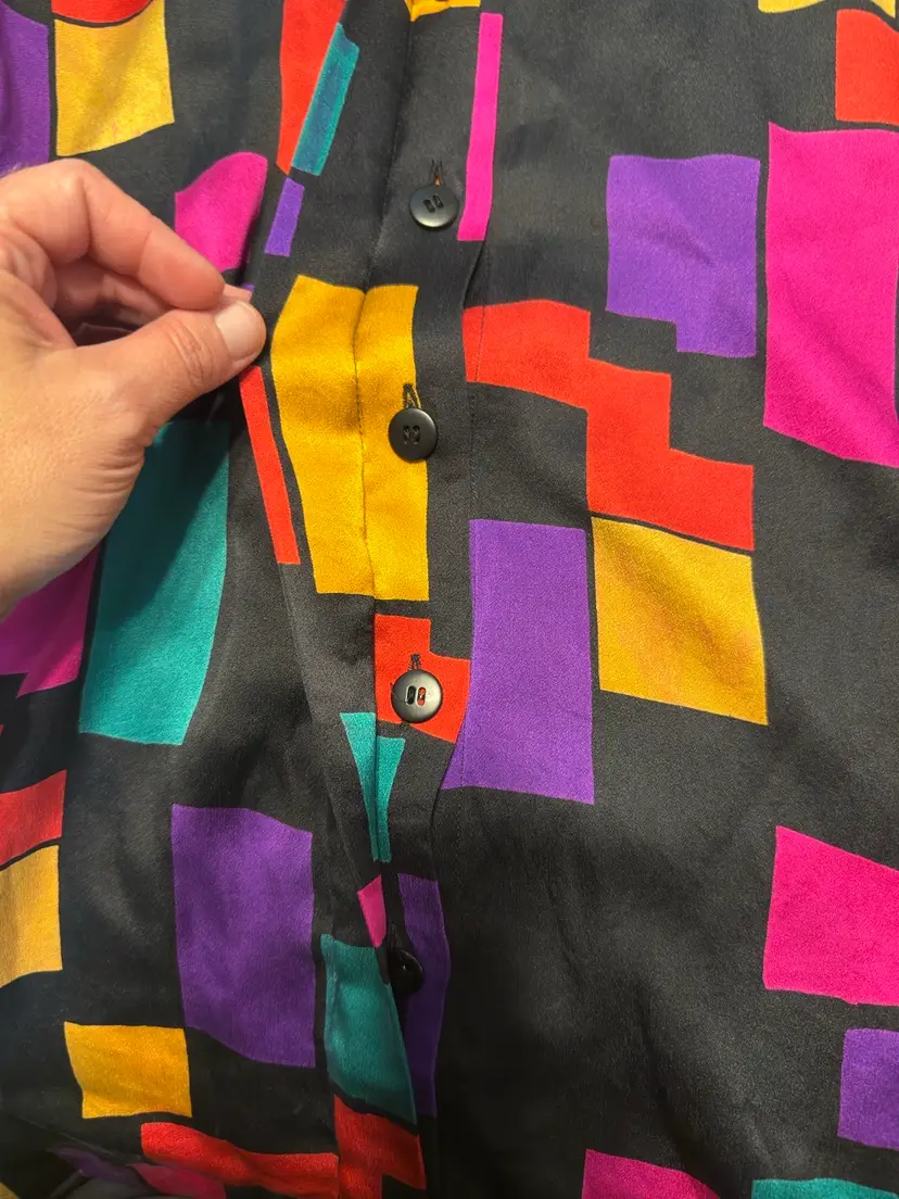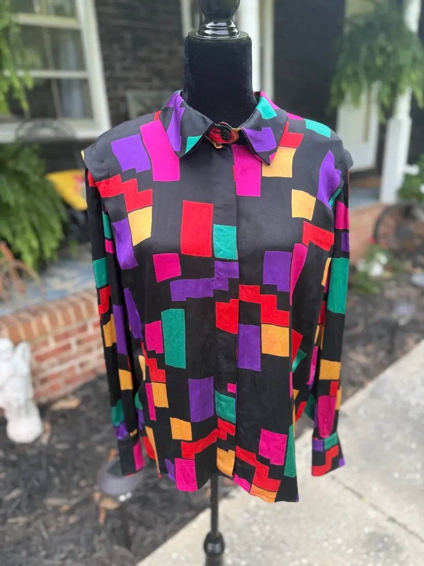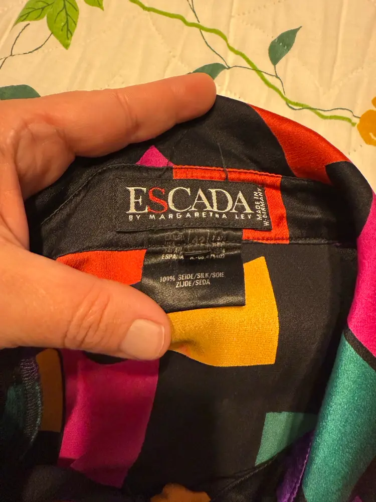 Escada by Margaretha Ley silk geometric color block blouse marked size ‘42’ This is such a fun print and would be perfect with a loud vibrant colored trouser or skirt. Fun & playful but sophisticated enough for drinks at the martini bar. Your collection needs this piece!