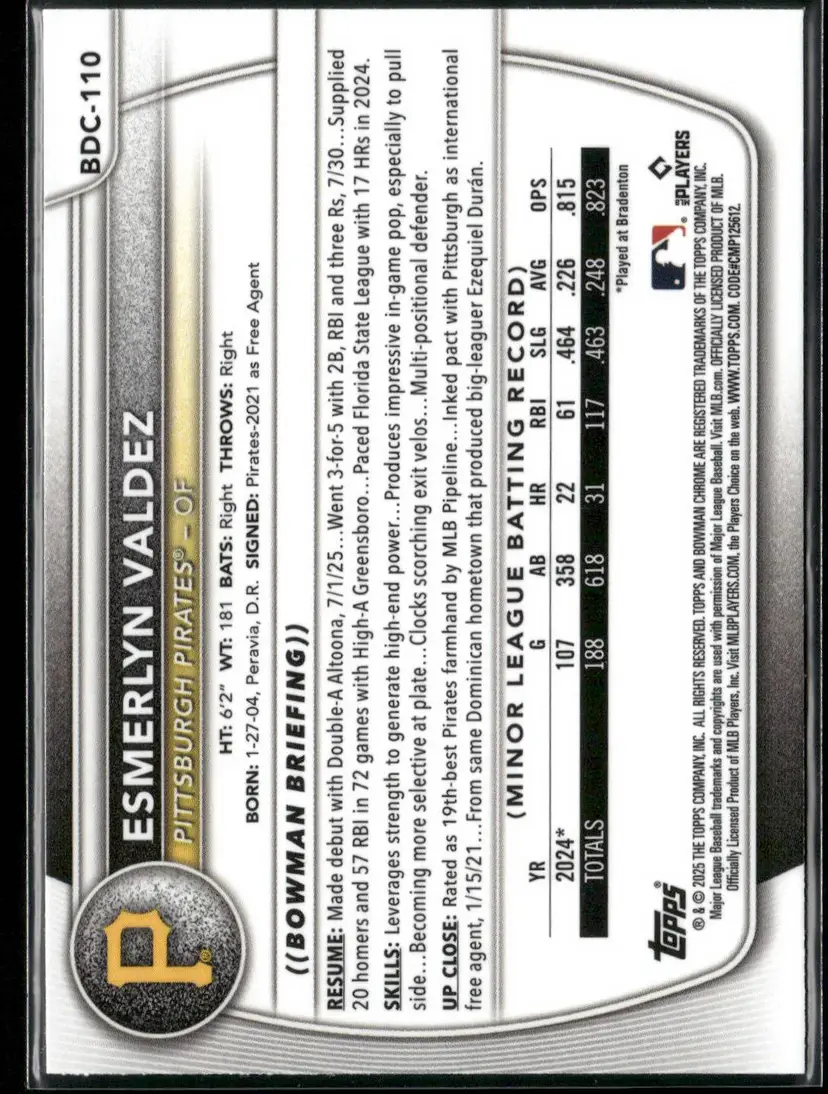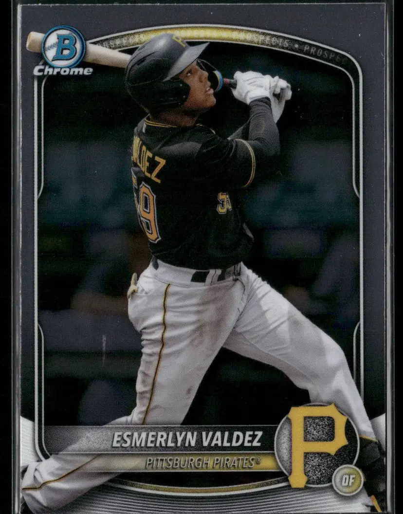 Check out this Esmerlyn Valdez card from the 2025 Bowman Chrome Prospects series. A must-have for any Pittsburgh Pirates fan or card collector.
