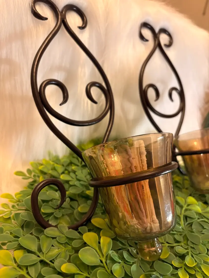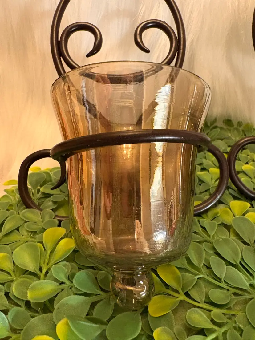 Espresso Metal Wall Sconce Pair w/original Bell Amber Slag Glass Candle Cups