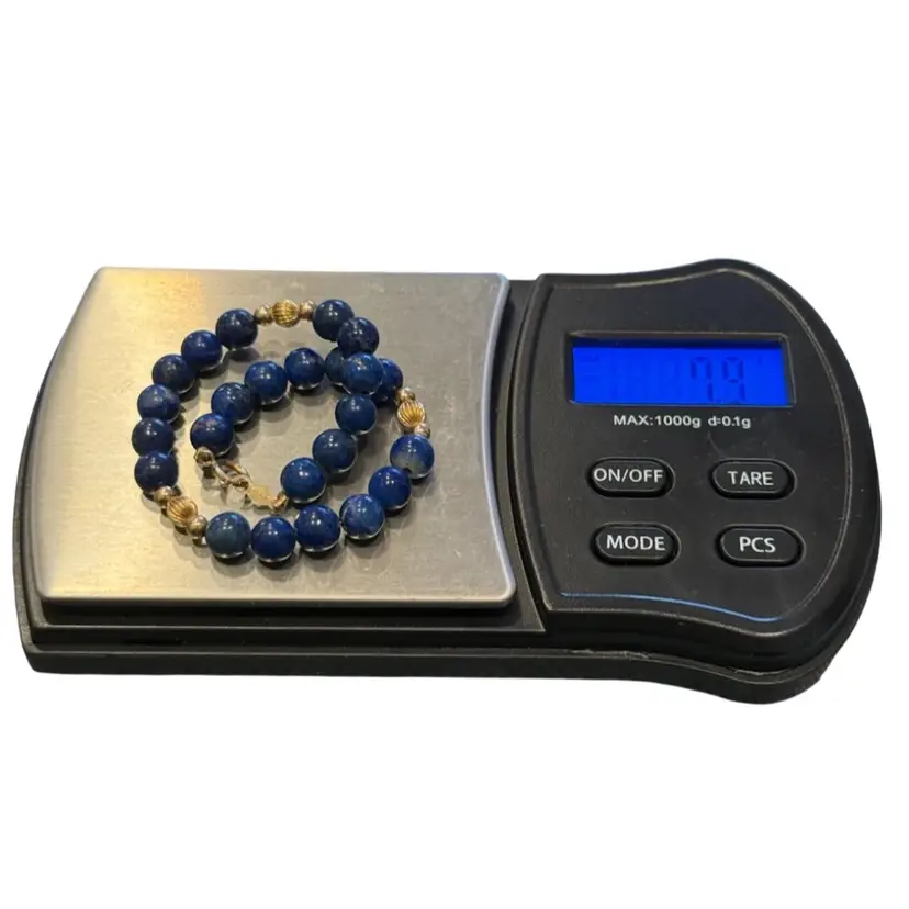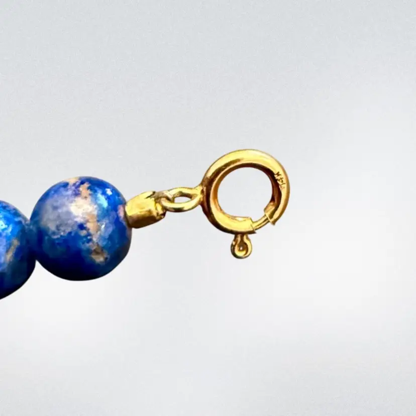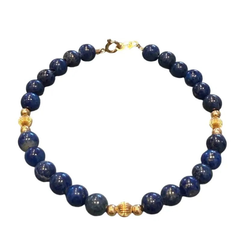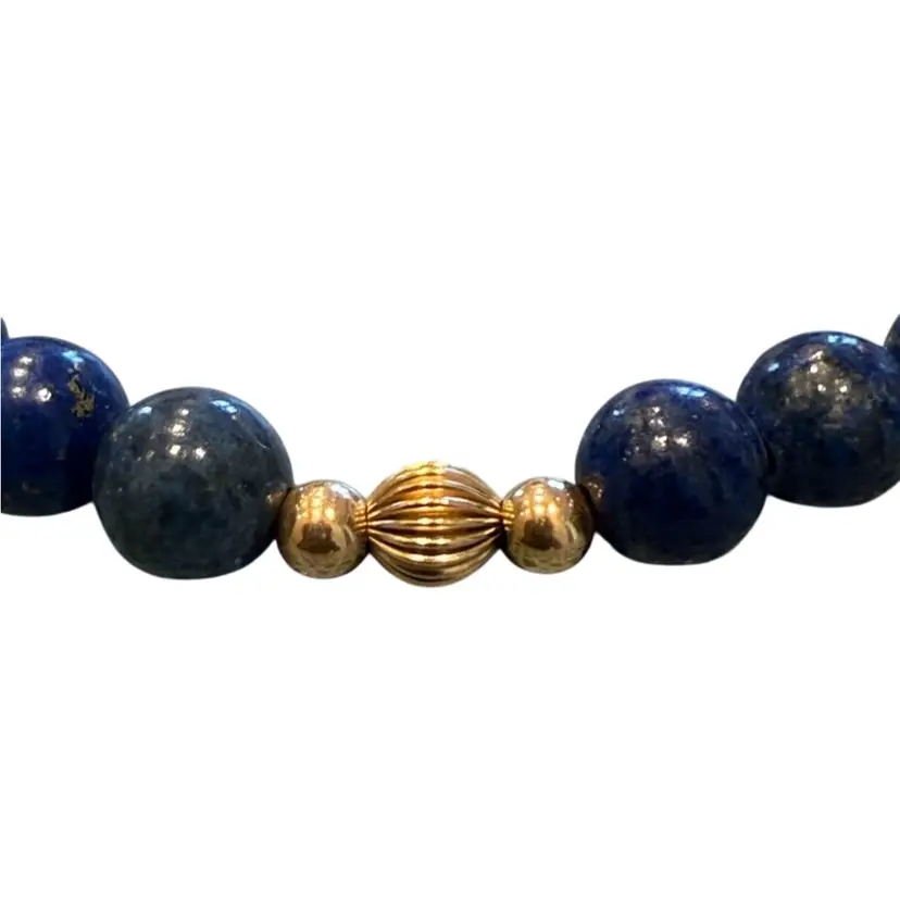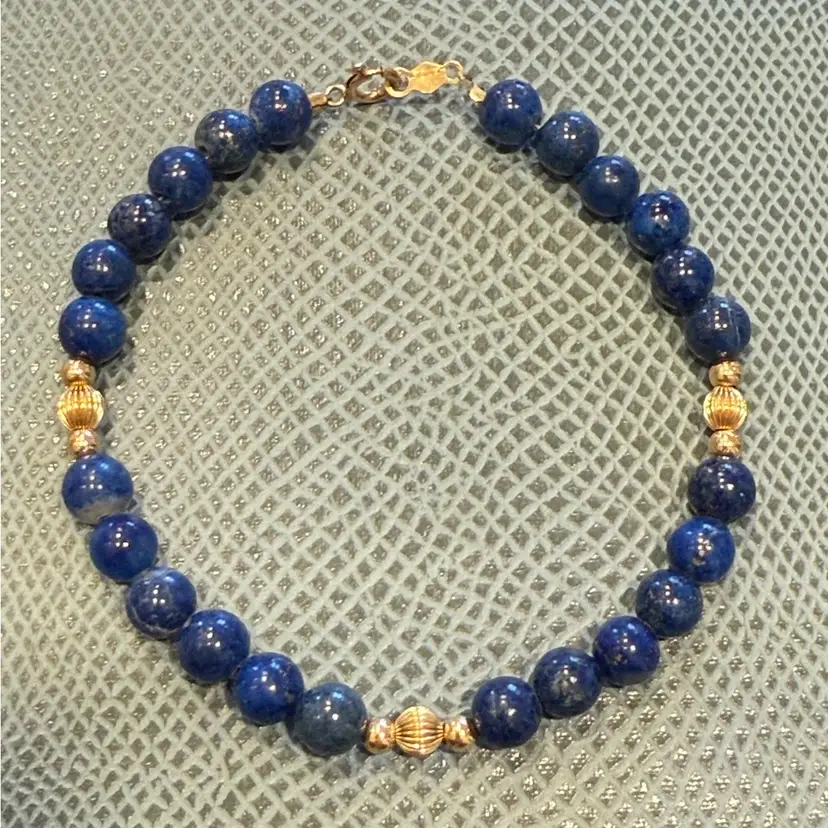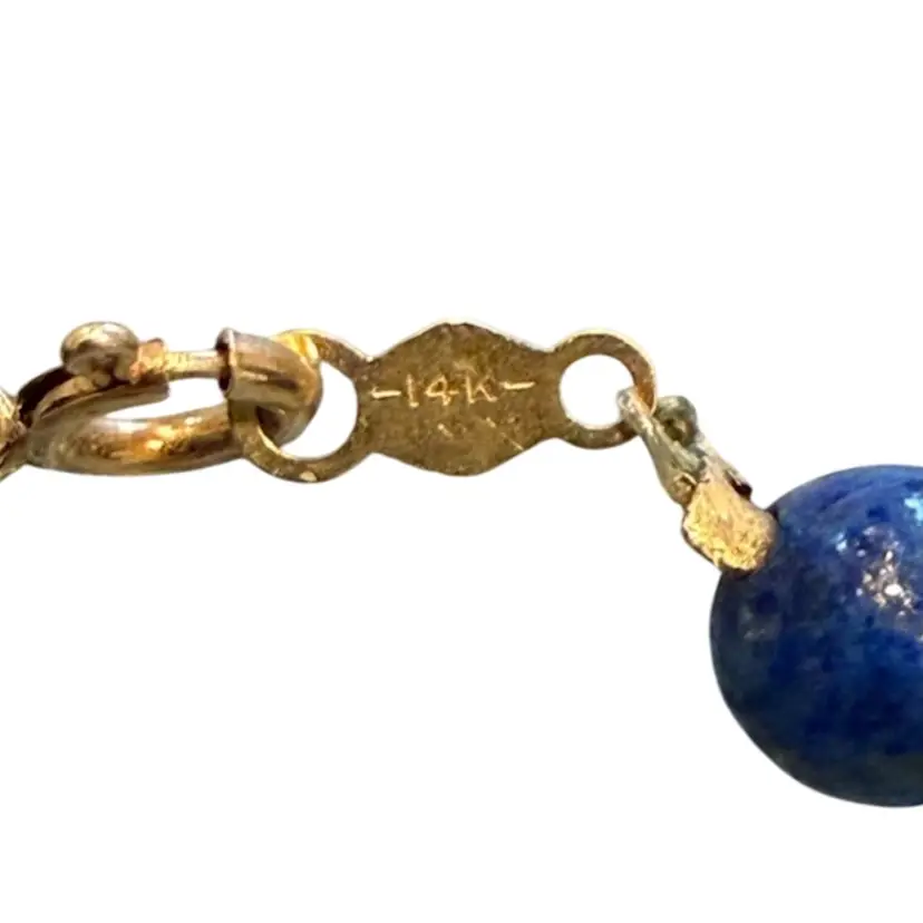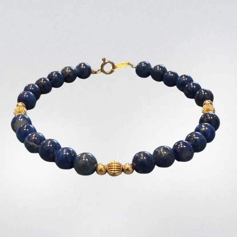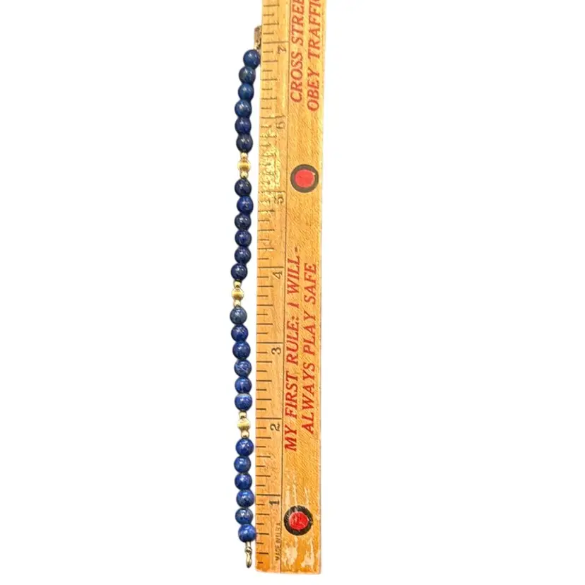 This Estate 14k Gold Lapis Lazuli Beaded Bracelet features a natural blue lapis lazuli stone beads with 14k yellow gold accent beads and clasp. The bracelet has a spring ring closure and is 7 inches in length, weighing 7.9g.