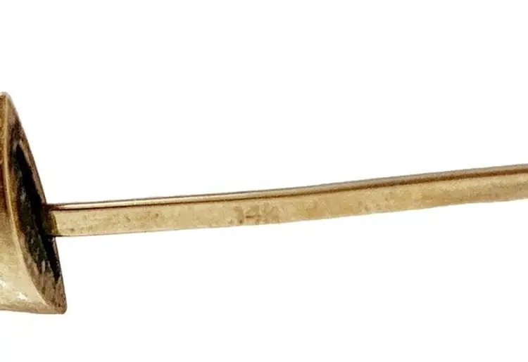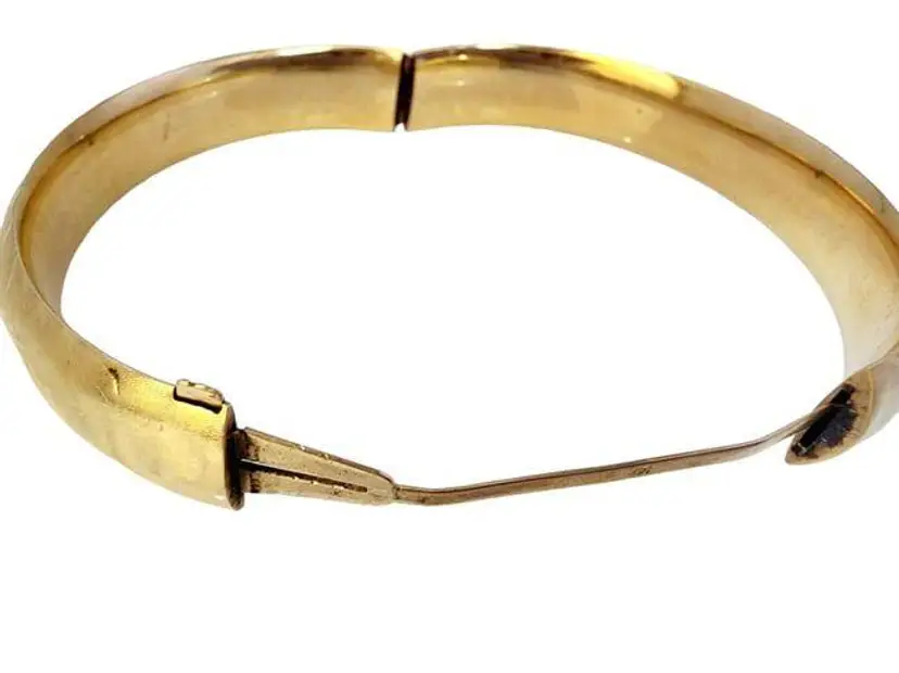 Inner diameter = 2.75". Width = 1/2" Color: Gold Condition: Good vintage; There are a few tiny dents on both sides of the hinges. Signed: 14kt- Stamped on the inside bar. Details: Weighs 20.92 grams. Beautiful design.