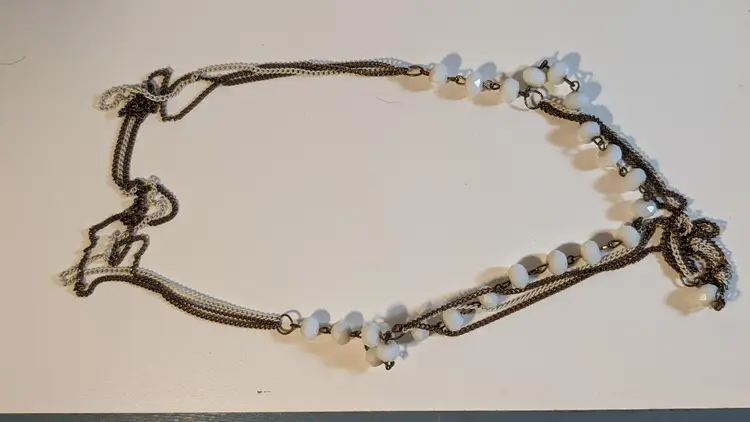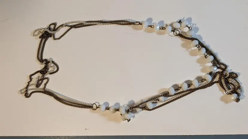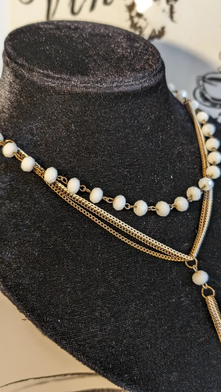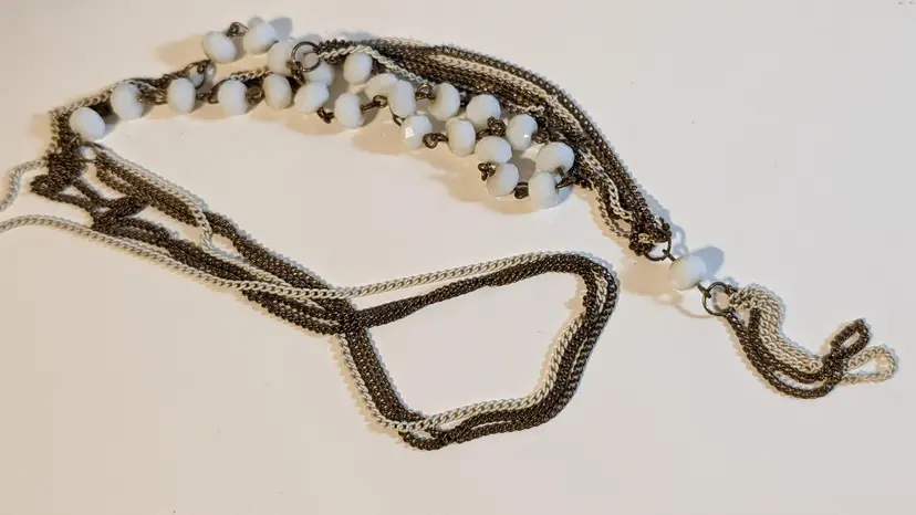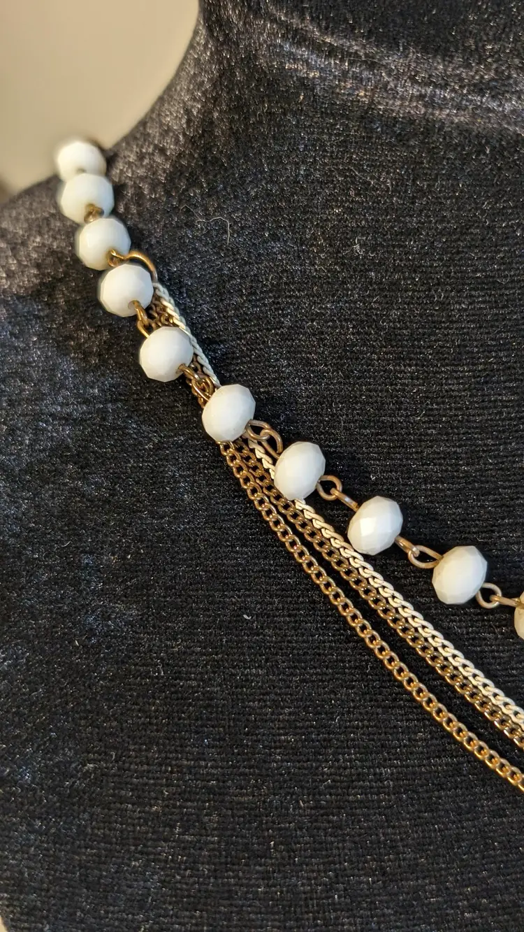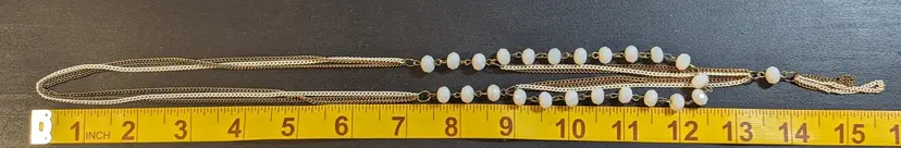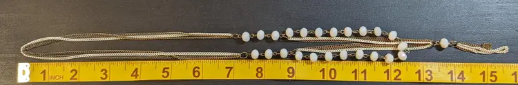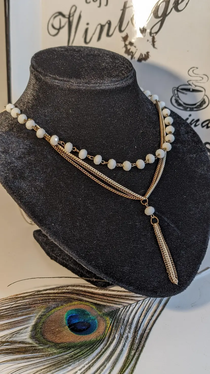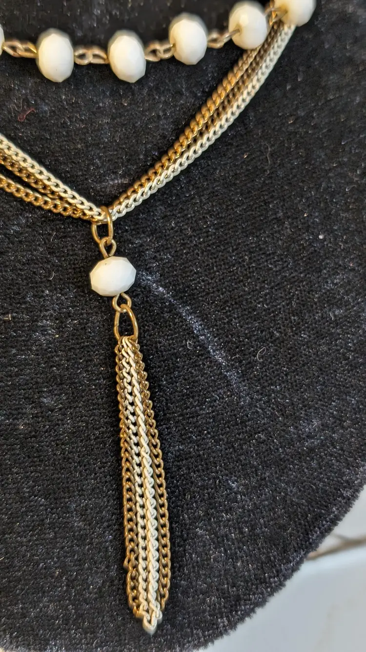 This vintage necklace features elegant white beads paired with a gold tone chain and a stylish tassel pendant. Perfect for adding a touch of vintage charm to any outfit. See photos for size reference.