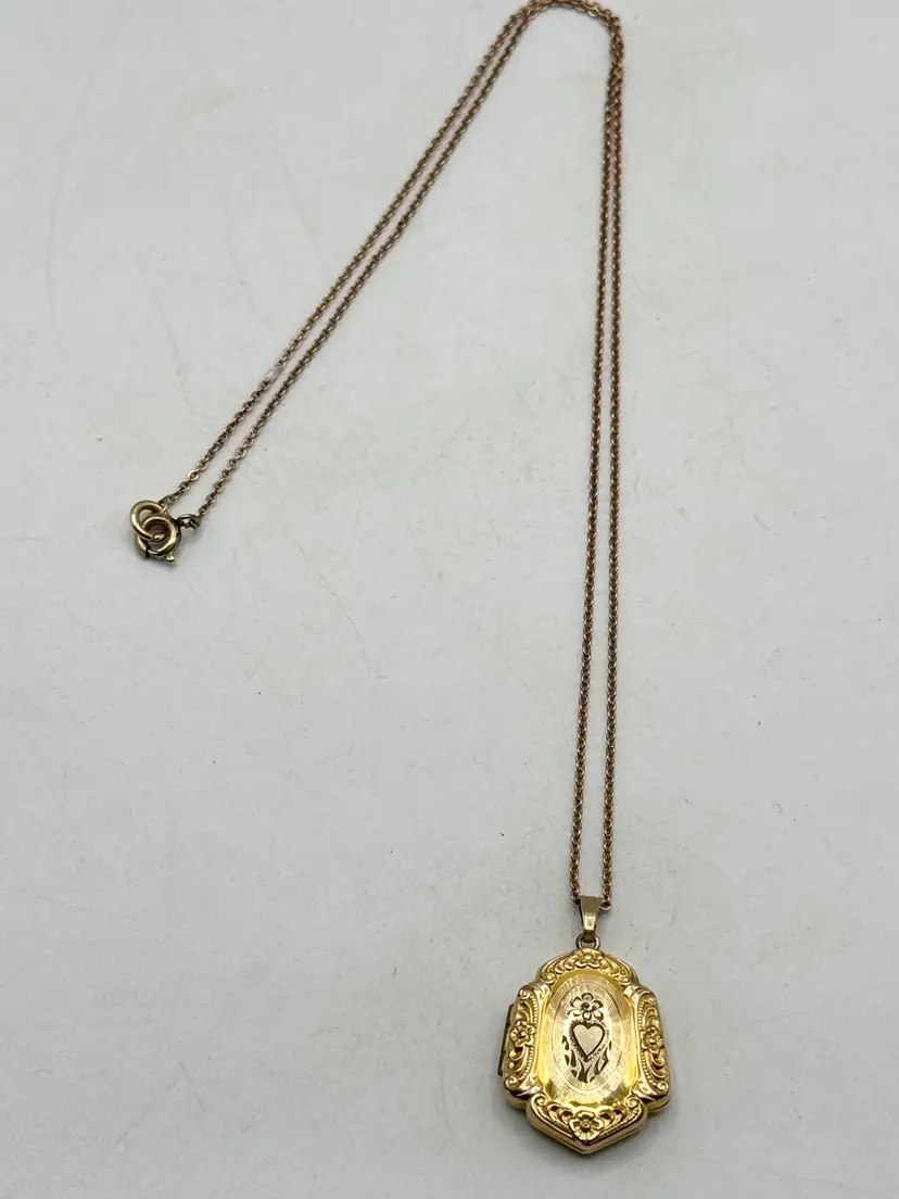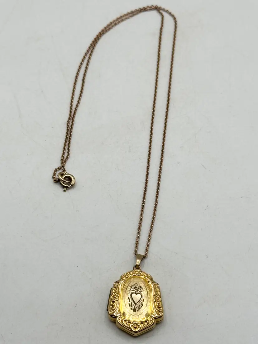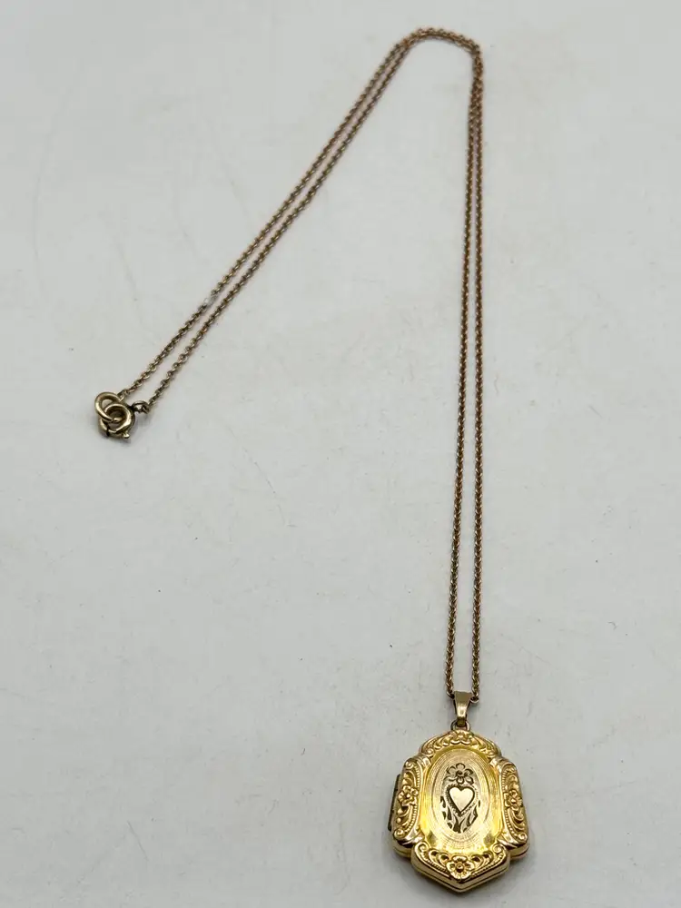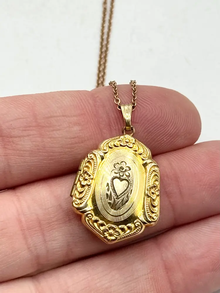 Estate Gold Filled Heart Flower Locket Necklace. Gold filled chain and gold filled locket. Unique shape with heart and flower. Vintage estate gold filled locket necklace. Locket opens and closes with ease and stays closed. MN56K.