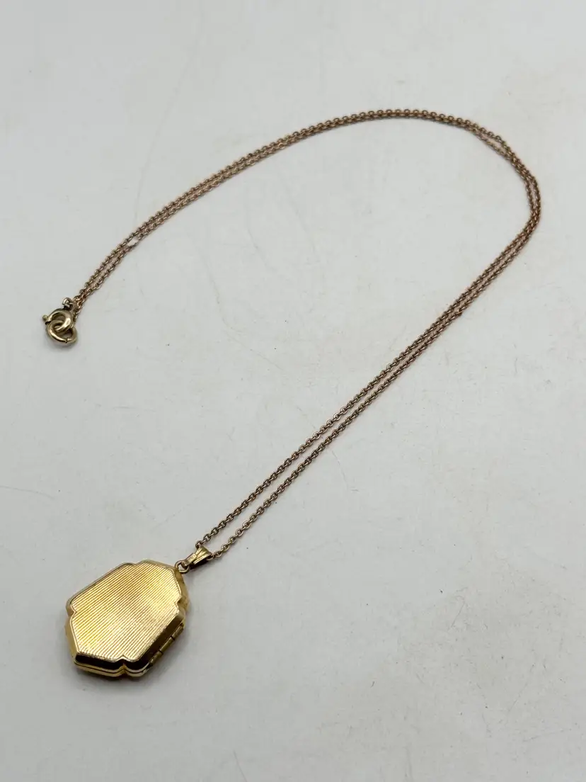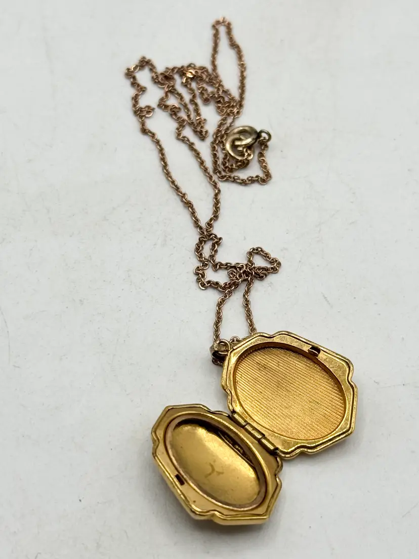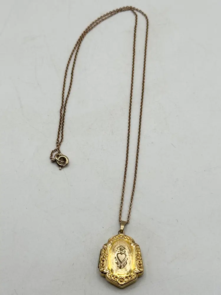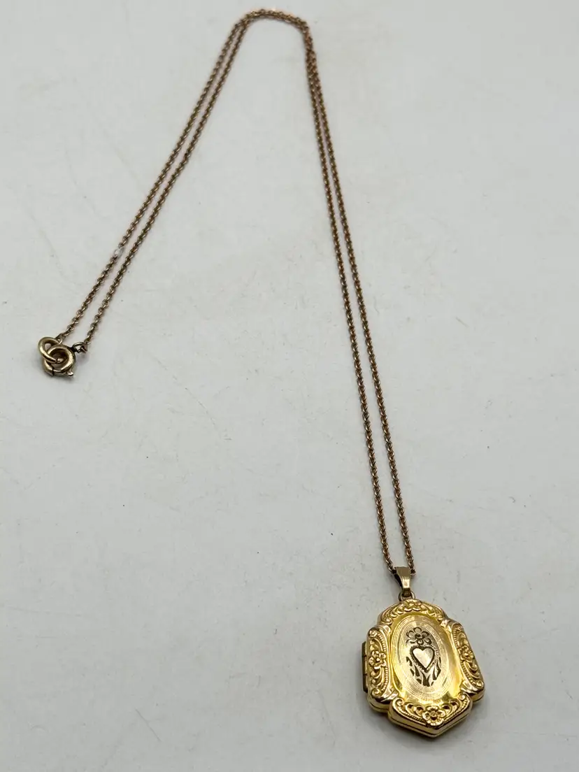 Estate Gold Filled Heart Flower Locket Necklace. Gold filled chain and gold filled locket. Unique shape with heart and flower. Vintage estate gold filled locket necklace. Locket opens and closes with ease and stays closed. MN56K.
