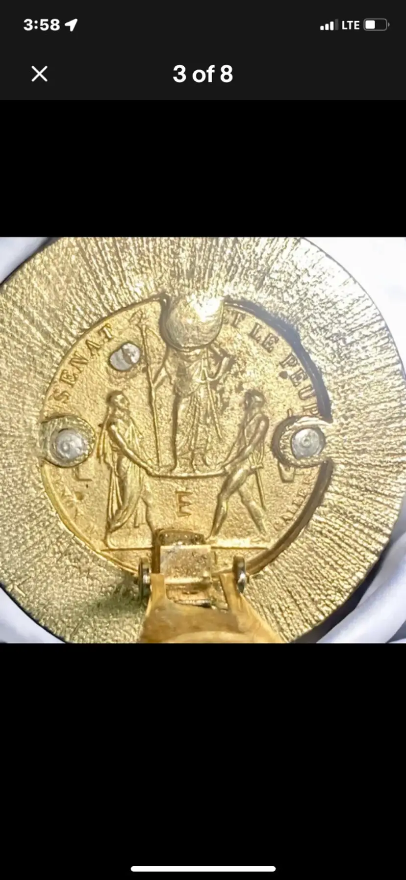 The gold-colored earrings are made of metal and have a unique coin that is both stylish and timeless. They measure 1 1/2" in length and are signed by the designer. These earrings make a great gift for anyone who loves coins and money, and they will surely become a cherished addition to your jewelry collection.
