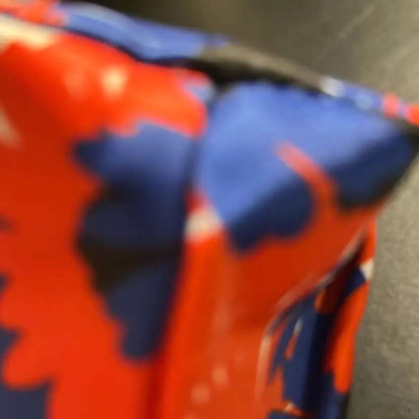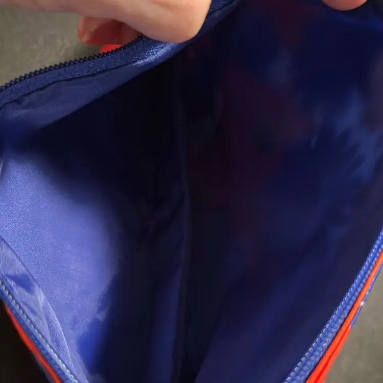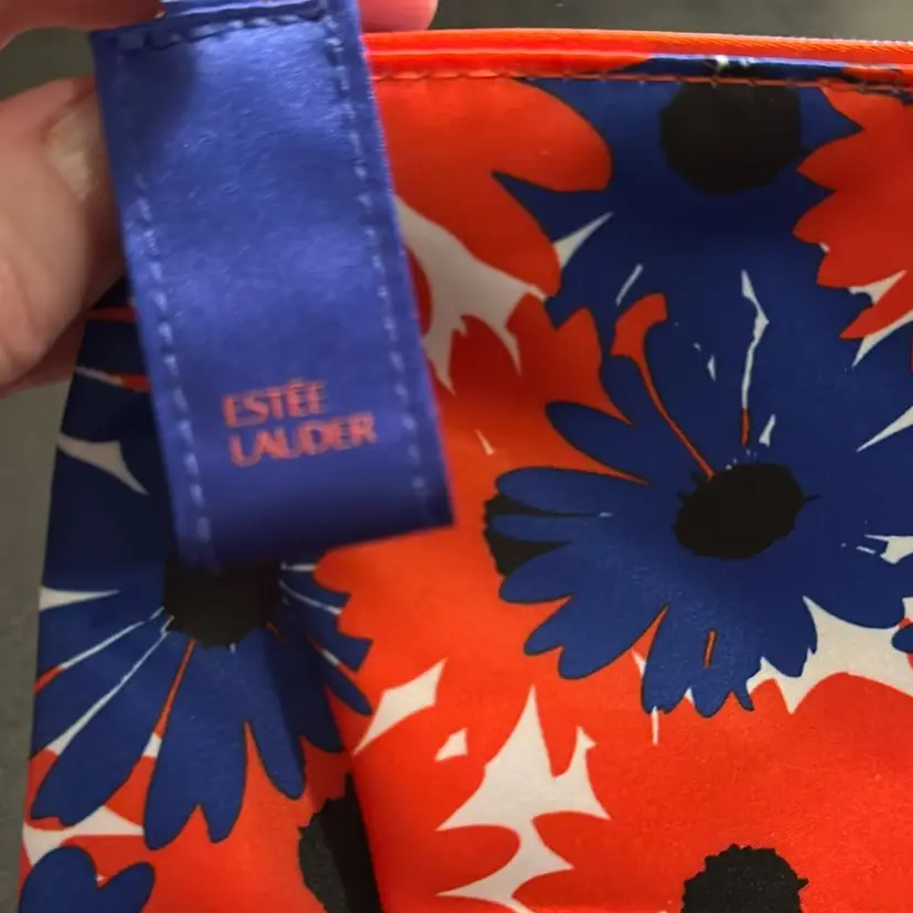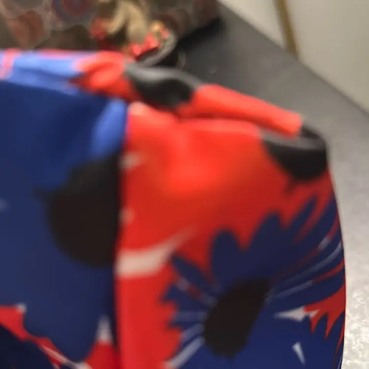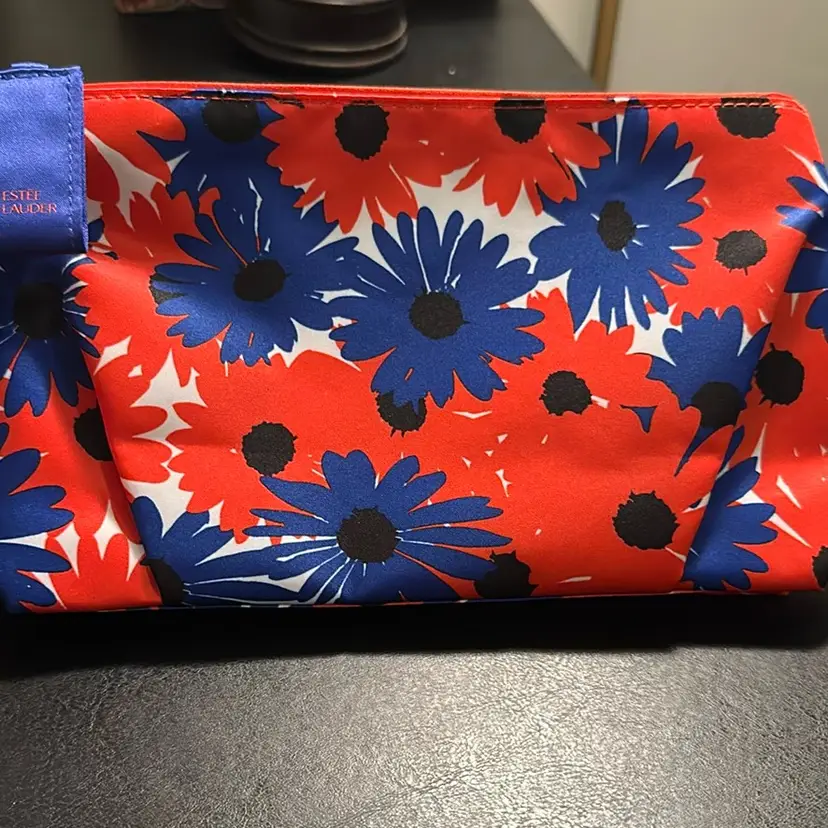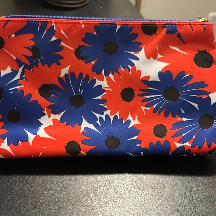 Red, white, blue and black floral cosmetic bag with blue lining. 100% polyester.