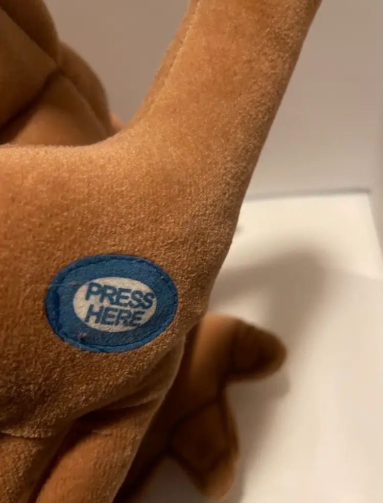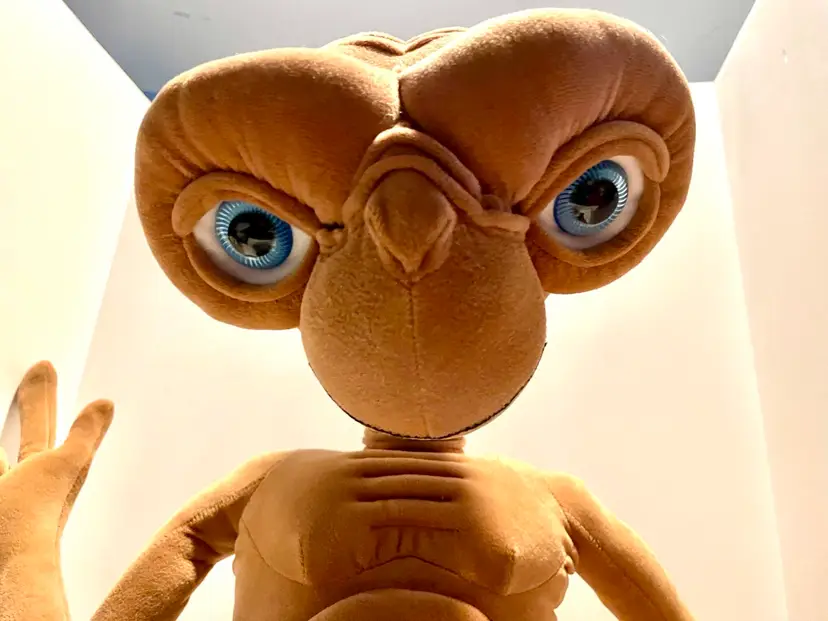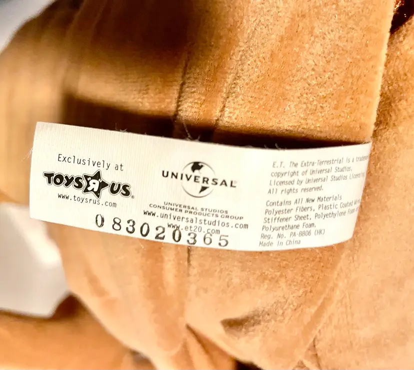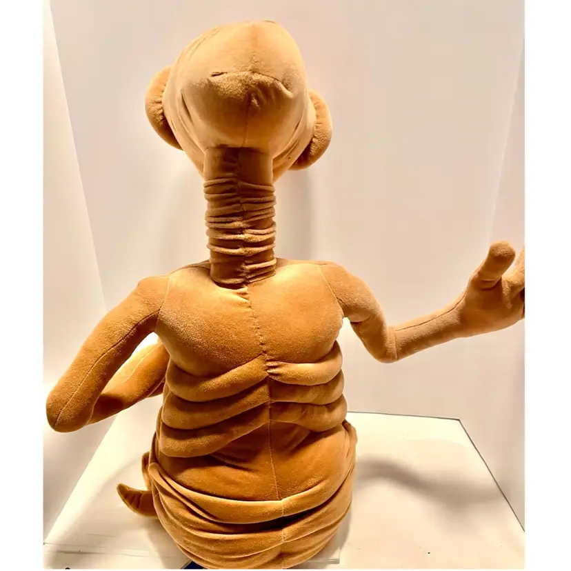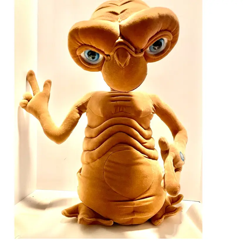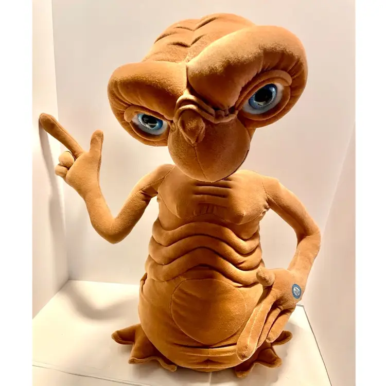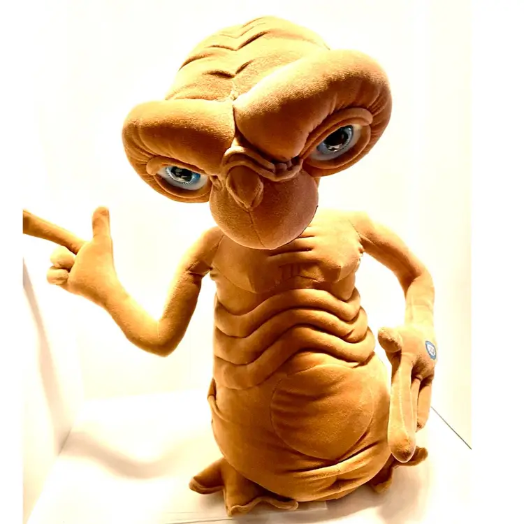 The product is a 24" tall talking and light up plush figure of E.T. from the movie "E.T. the Extra-Terrestrial." Manufactured in 2002 by Toys "R" Us, this vintage collectible features the iconic character from the beloved franchise. The figure is made of plush material with PVC elements, and is designed to recreate some of the memorable moments from the film, such as E.T.'s adorable and nostalgic handmade bicycle. Perfect for fans of the movie and collectors of E.T. memorabilia, this action figure brings a touch of whimsy and nostalgia to any display.