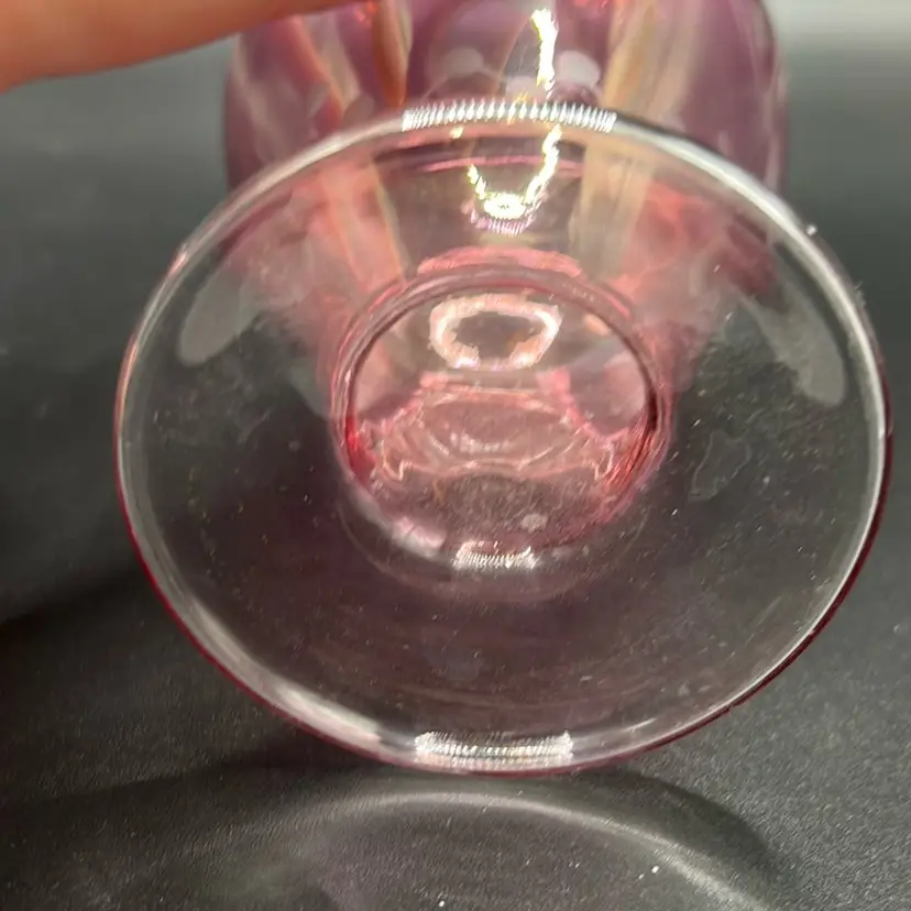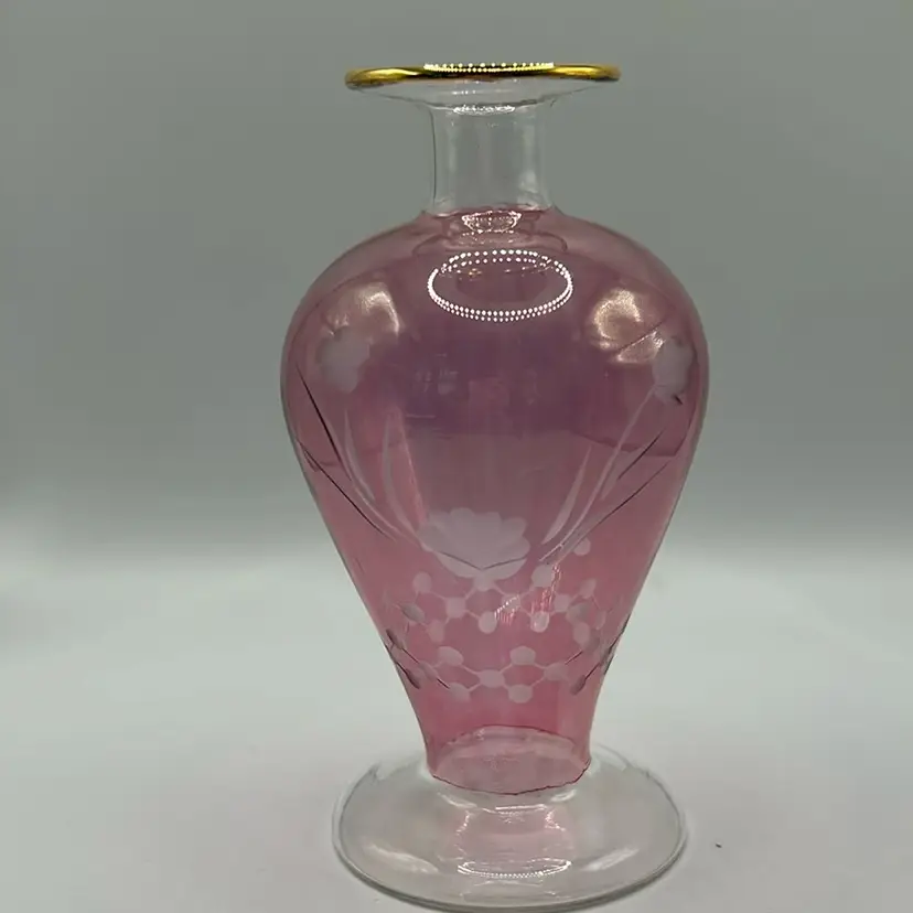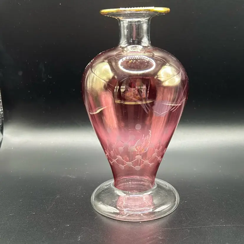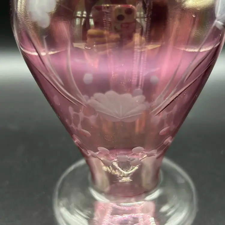 This is a beautiful cranberry bud vase with florals etched. It stands 5 inches tall and is 1.5 inches across the opening. There are no condition issues.