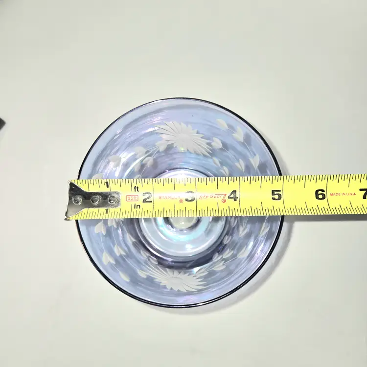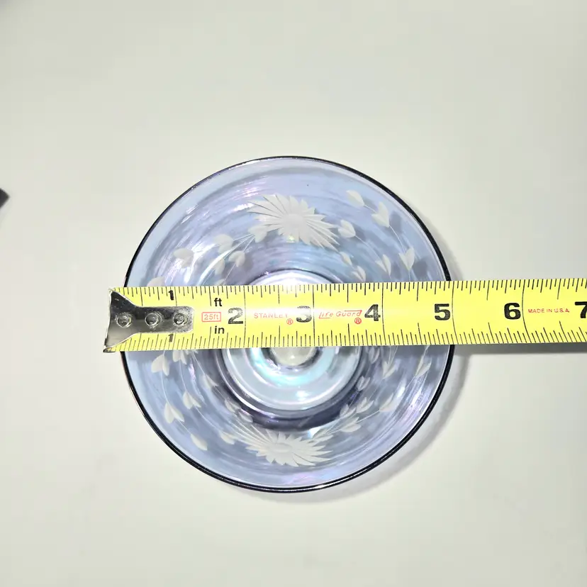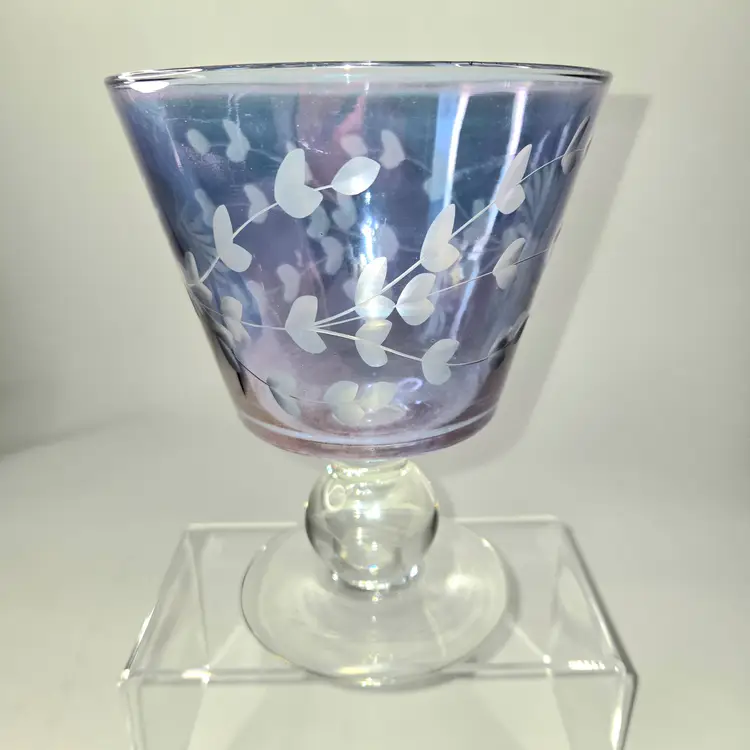 Hand blown pretty pedestaled compote. Etched floral design. Color changes with light, blue to lavender. No call outs.