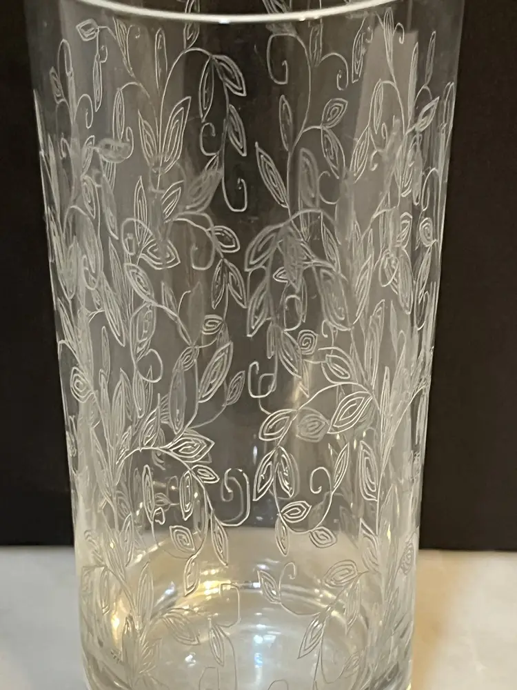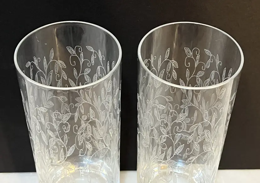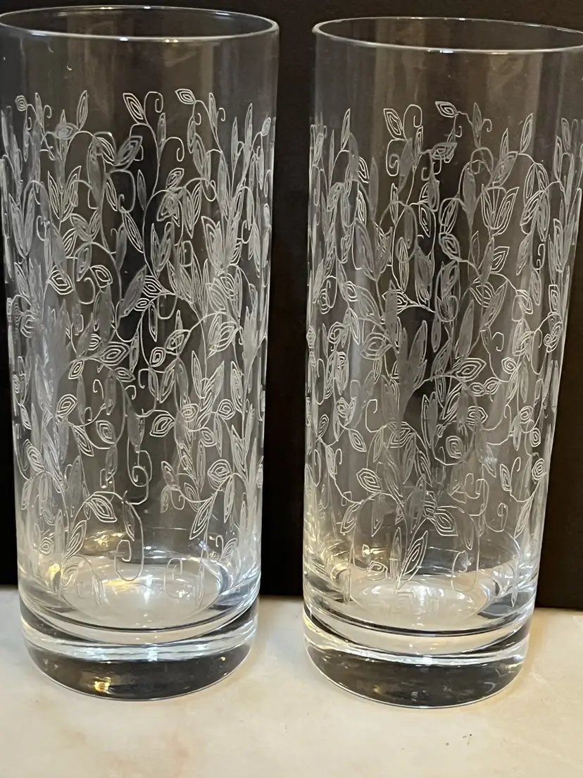 Two Etched Leaf Pattern Flat Tumblers by American Cut. Set of two 11oz. drinking glasses that stand at 6" tall. Elegant etched leaf & vine pattern.