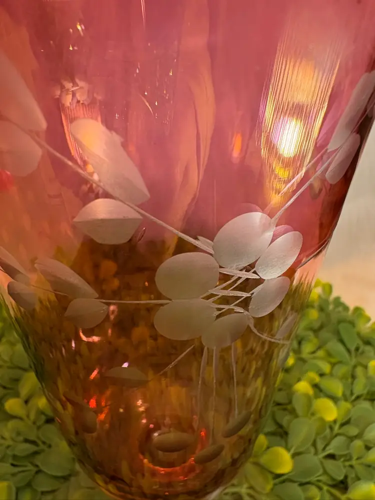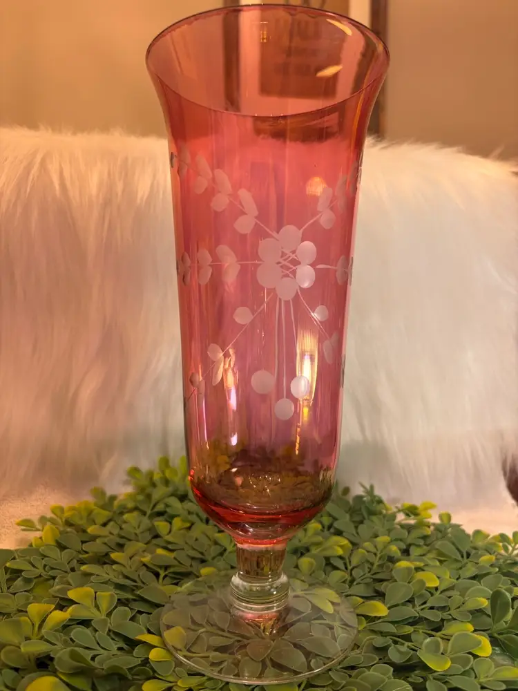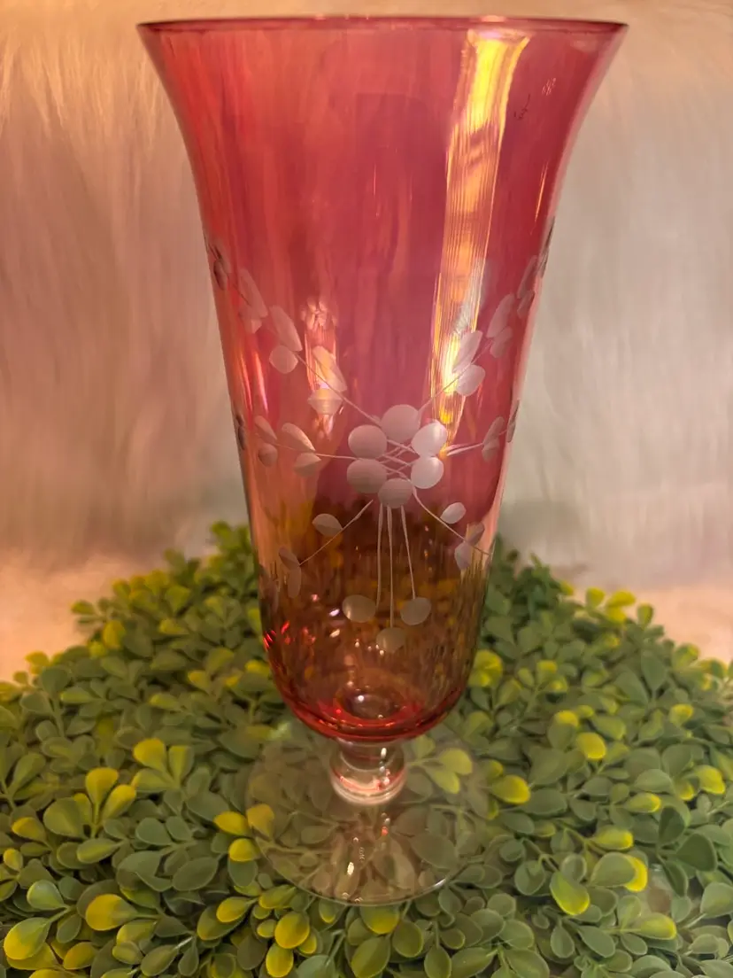 Etched Ruby Flash Glass Vase w/Floral Motifs & Pedestal Base 10”