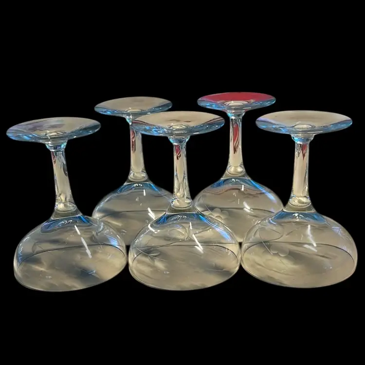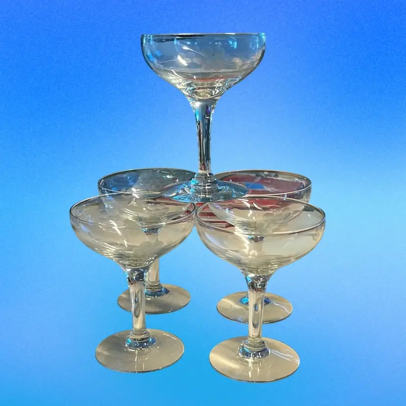 Beautiful set of five glasses. Possibly antique, the woman who gave these to me is 94 and she remembers as a child eating sherbet out of the glasses. No chips or scratches. They are approximately 4 1/2 inches tall and 3 1/2 inch is in diameter. (BSA*IC)