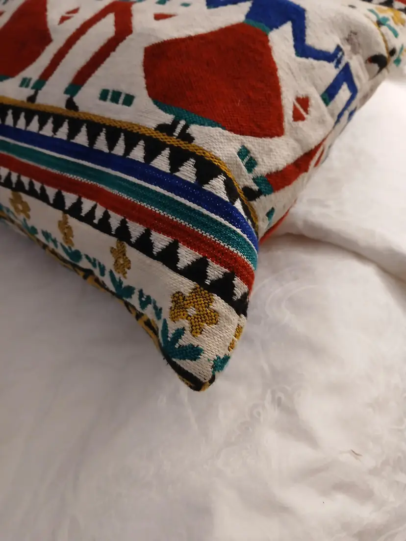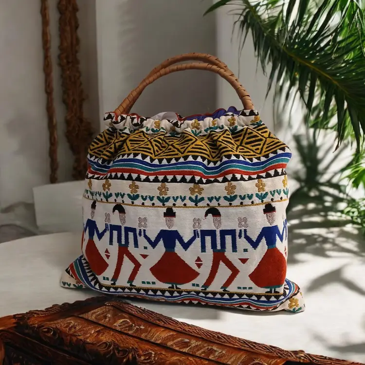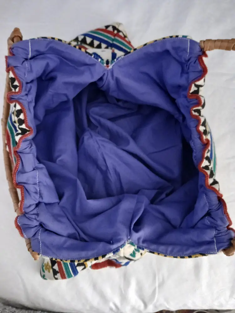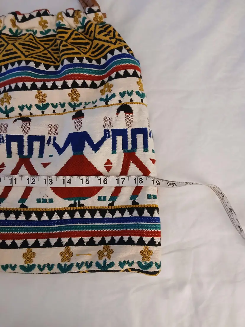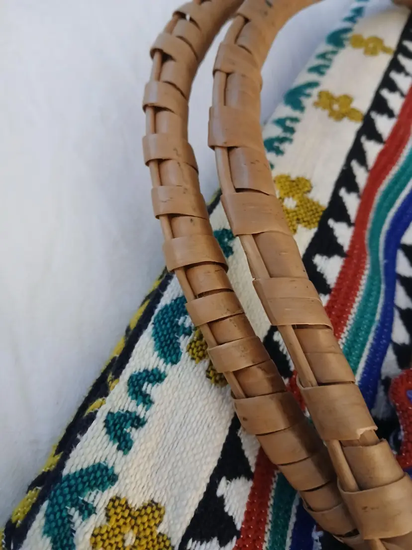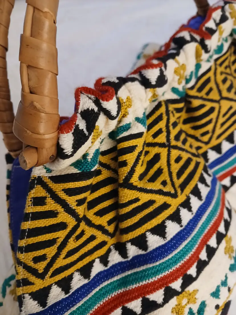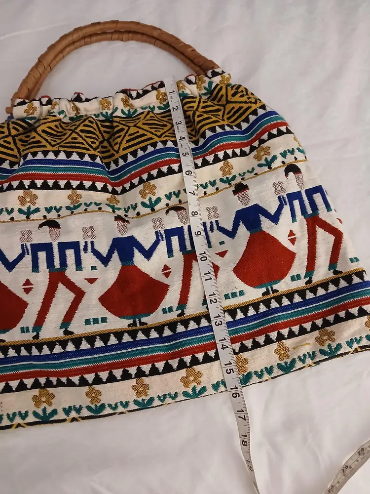 This vibrant tote bag features a ethnic unique and colorful design, perfect for adding a pop of color to any outfit.All artisan made, the intricate patterns and sturdy bamboo handle make it both stylish and practical.minimal use, euc!.ready for spring ,summer!