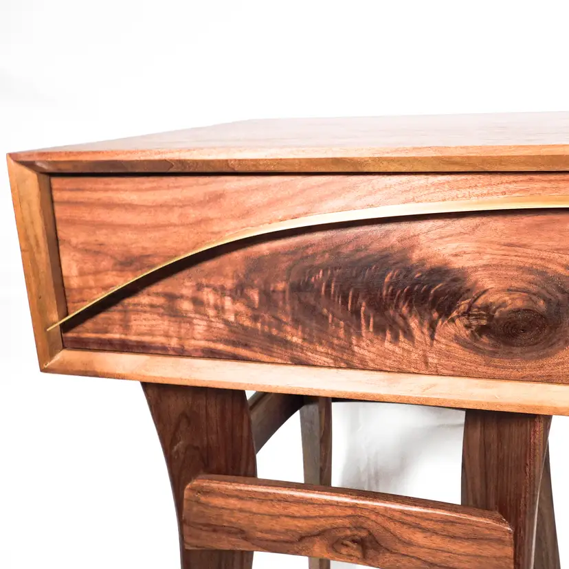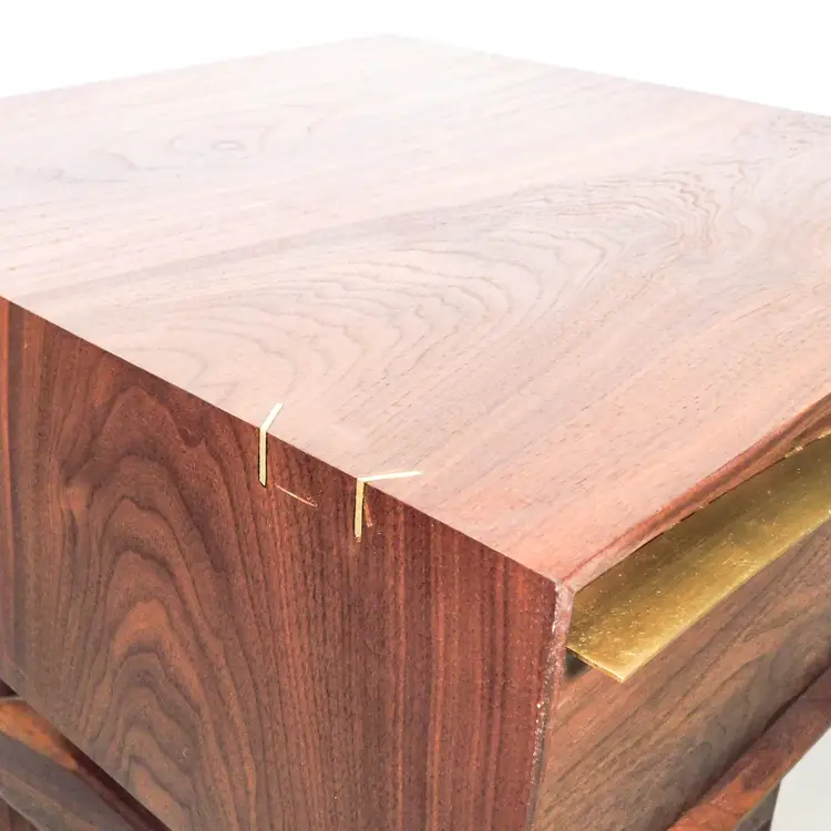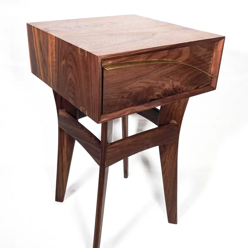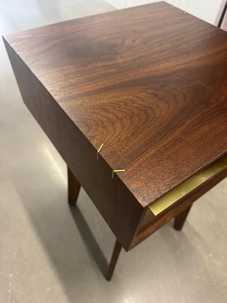 This nightstand set is a 1 of 1 piece made of 100% natural Walnut with a solid brass drawer pull and 3 sets of solid brass splines on the corners. The grain of the walnut is wrapped around the top making it look like the grain never stops. The legs have leveling feet to ensure it stays secure to the most uneven floors. The centers are drawers which feature under-mount soft close slides and drawers made of solid walnut as well.