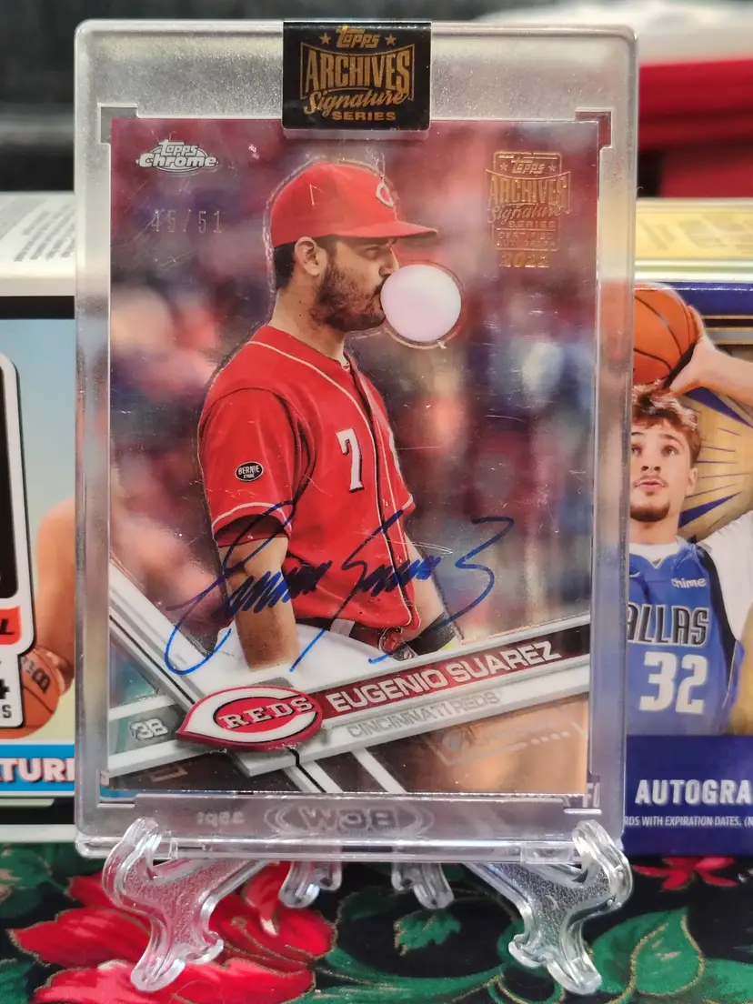 This card is from 2022 Topps signature series. It features Eugenio Suarez, a free agent third basemen who most recently played for the Seattle Mariners but is portrayed on the card playing for the Cincinnati Reds in 2017 Topps Chrome. The card is signed in blue ink, on the card. The card is also encased in plastic by Topps, and is in great condition