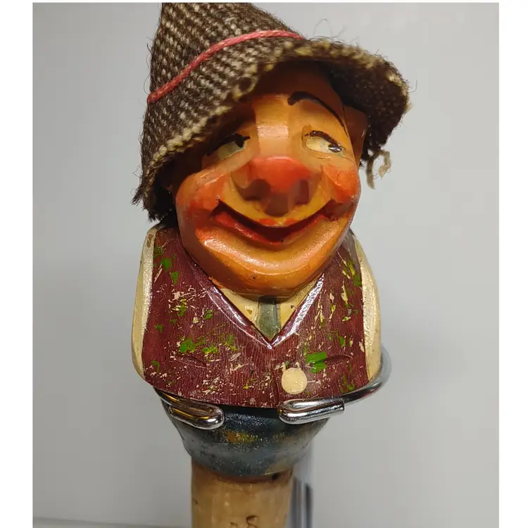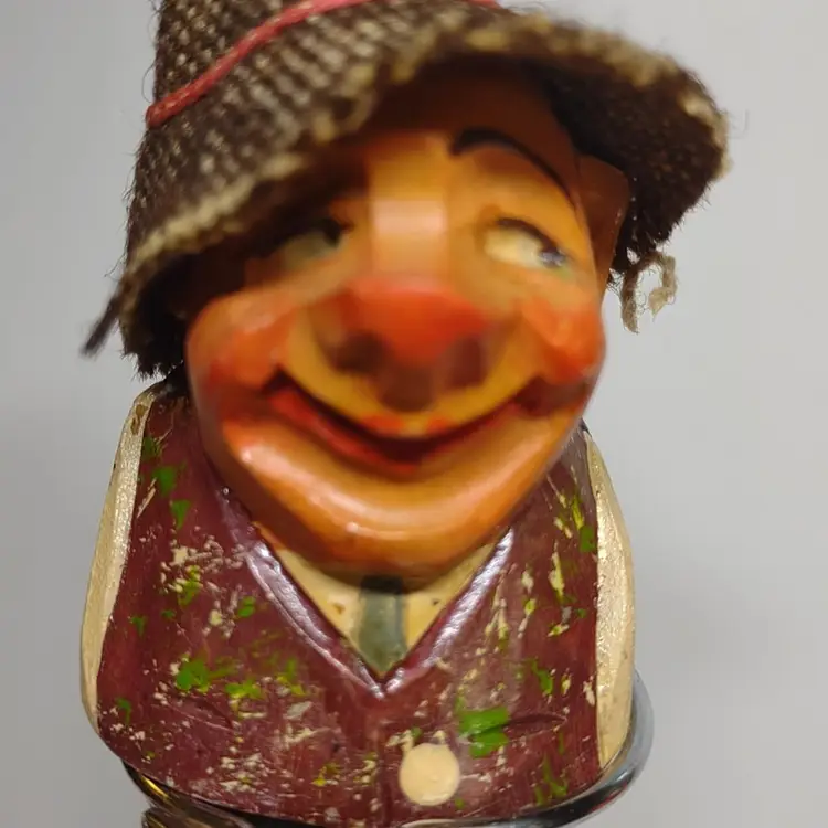 Bottle stopper is vintage and is wood carved and hand painted. His hat is a cloth fabric material Size is 4" tall with the cork. Has wear to the painted surface and the cork base. STAND NOT INCLUDED