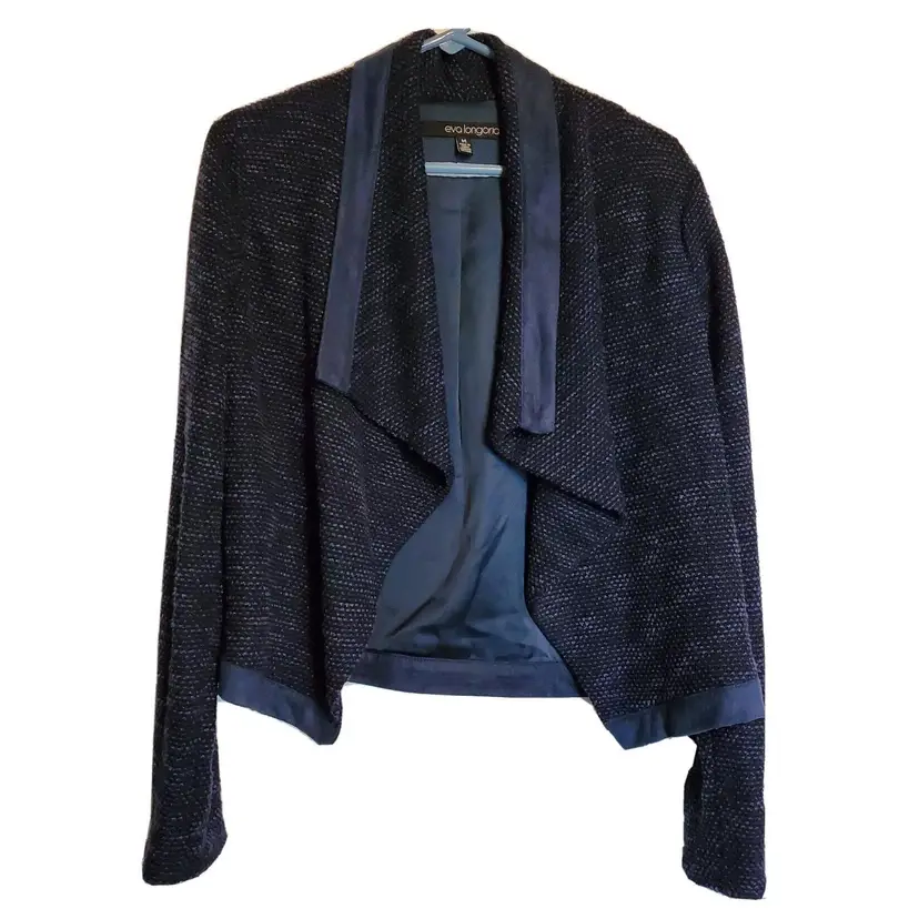 Brand: Eva Longoria color: blue, black, size: medium fabric: 84% polyester, 16%cotton open jacket tweed soft outside material inner lining measurements from armpit to armpit-23" from shoulder to bottom of shirt-22"