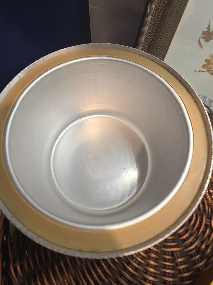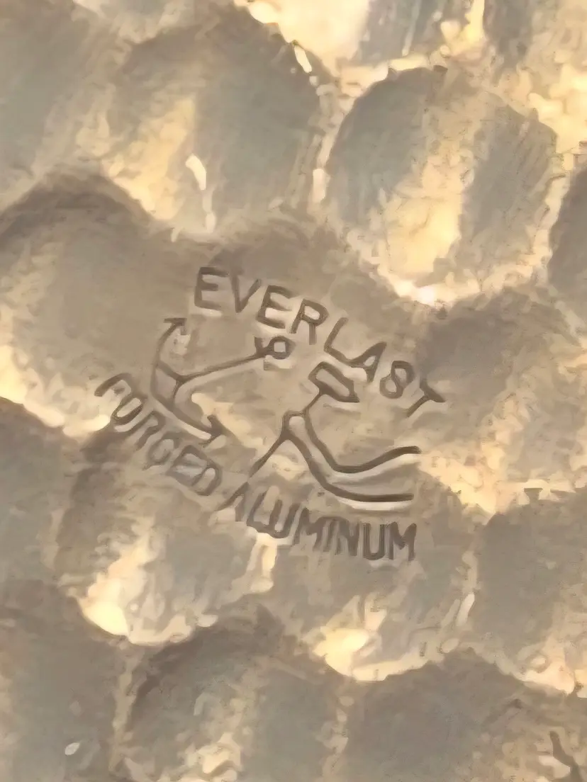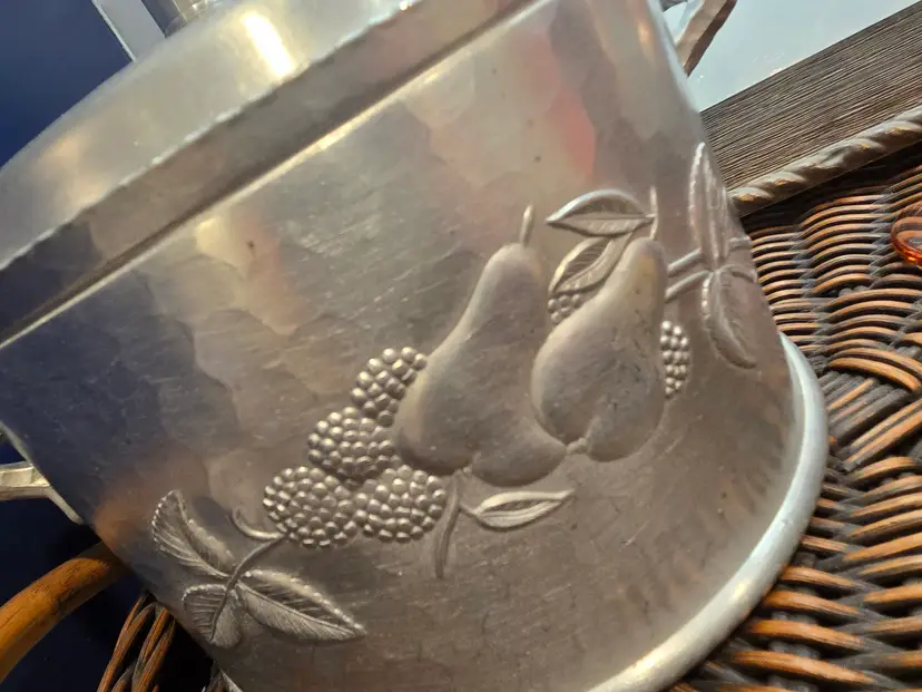 Great conversation piece! This mid-century modern (MCM) barware piece is an Everlast Forged Aluminum Ice Bucket. It is insulated, has a lid, and features a fruit motif with pears and berries. Made in the United States in the 1950s, it's round, 7.5 inches tall and has a width of 11 inches with handles. The lid and handles have a hammered metal design. Fill it with ice and set it out at your next get-together.
