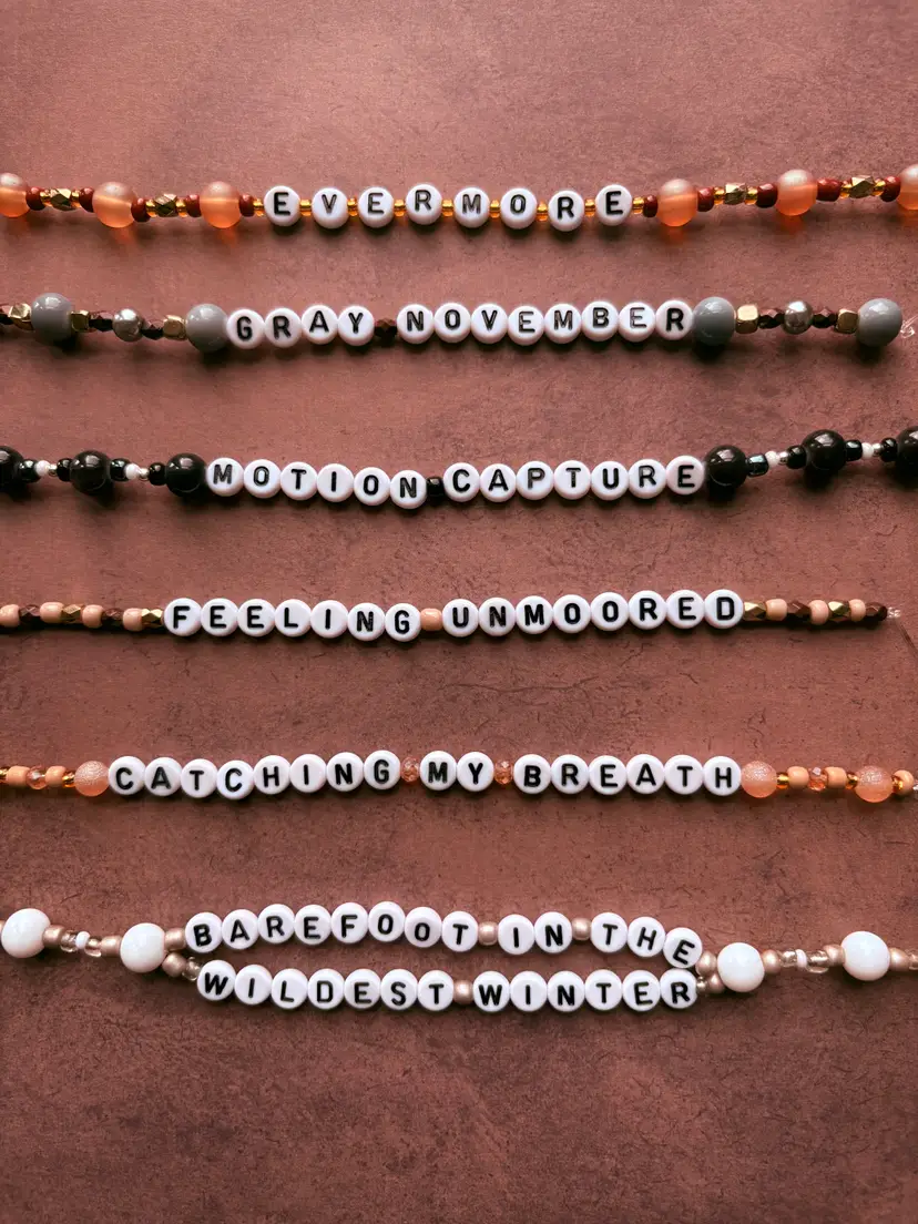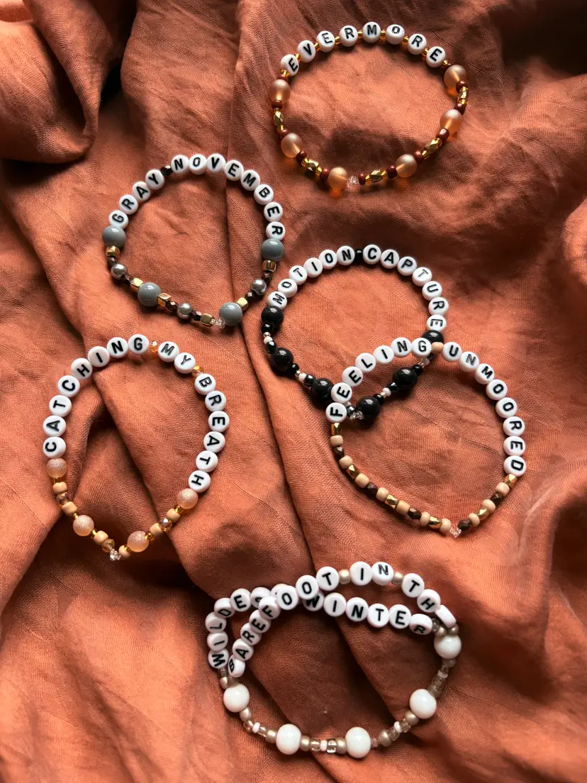 Are you feeling unmoored this gray November? 🤎 Check out this bracelet set! The bracelets you receive will say the same lyrics as those in the pictures. The set includes one double-strand bracelet. The bracelets are made with stretch elastic and do not have clasps. They are each approximately 6.5 inches in length.