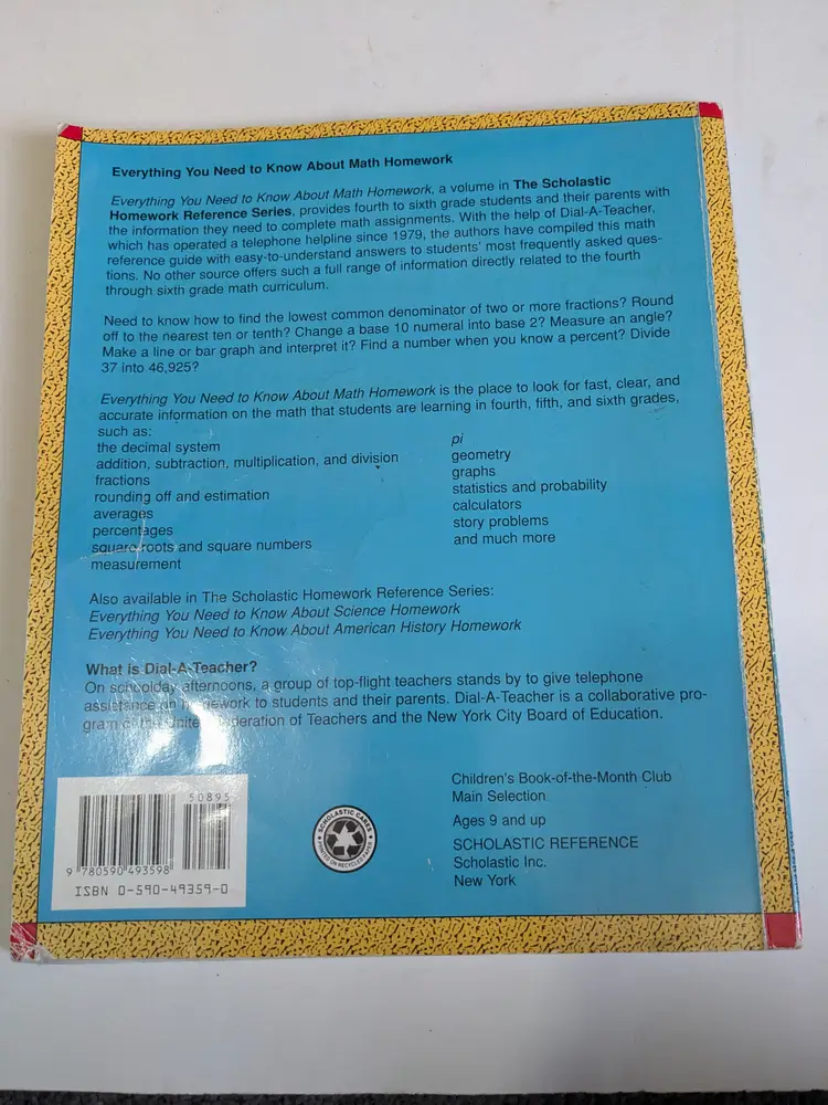 Everything You Need to Know About Math Homework, a volume in The Scholastic Homework Reference Series, provides fourth to sixth grade students and their parents with the information they need to complete math assignments. With the help of Dial-A-Teacher, which has operated a telephone helpline since 1979, the authors have compiled this math reference guide with easy-to-understand answers to students’ most frequently asked questions. No other source offers such a full range of information directly related to the fourth through sixth grade math curriculum.