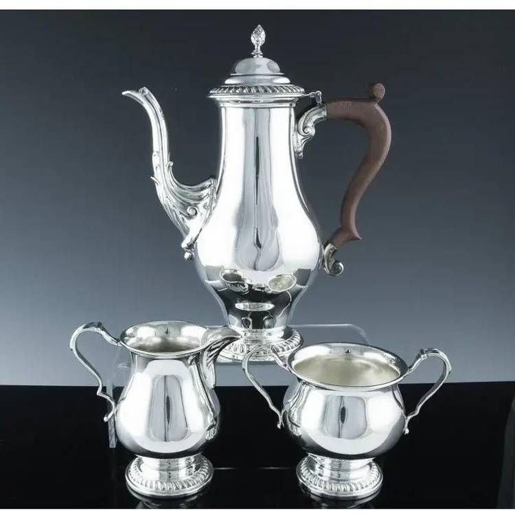 Presented for your consideration is a Excellent Antique c1920 Georgian Revival Barker Ellis Silver Plate Tea or Coffee Pot Cream Jug Sugar Bowl 3pc Service Set. Made circa 1920 by the world renowned Barker Ellis Company and a direct copy of a Georgian Period Set that would have been made around 1820. Excellent details throughout including Flame finial, certainly an heirloom quality service. So superb overall, you will not be disappointed.