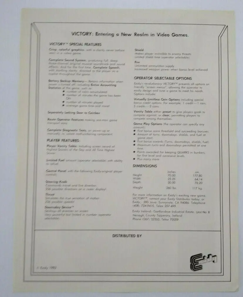 Modified Item: No Country/Region of Manufacture: United States Original/Reproduction: Original Year: 1982 Game Title: Victory Brand: Exidy Theme: Retro Arcade: Flyer