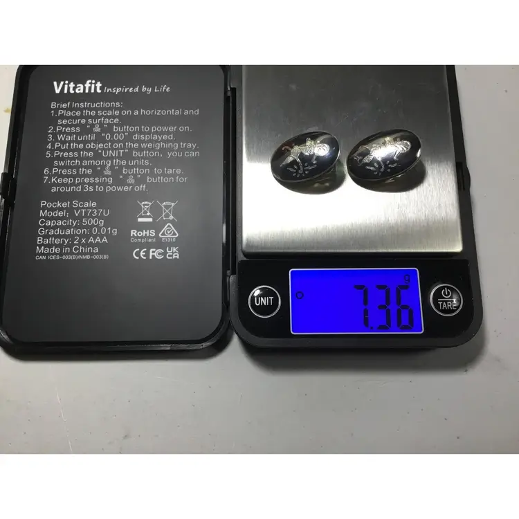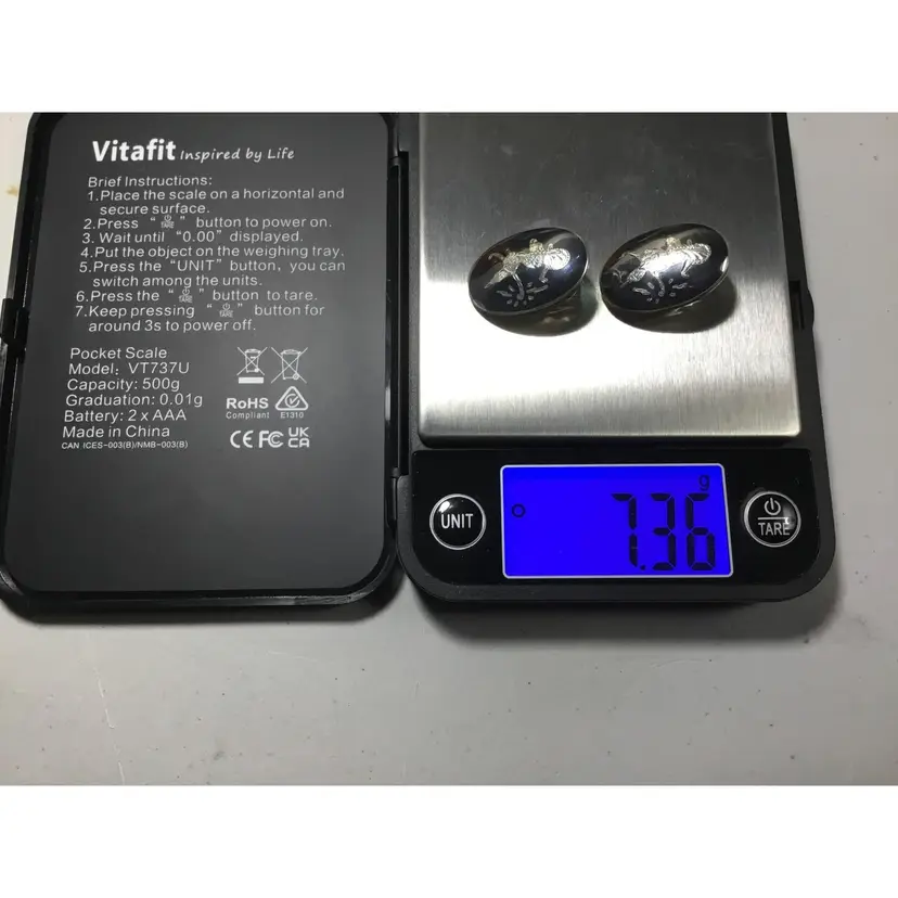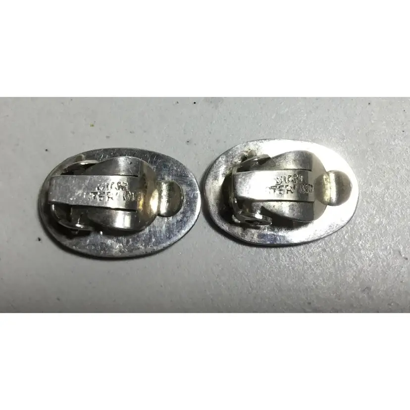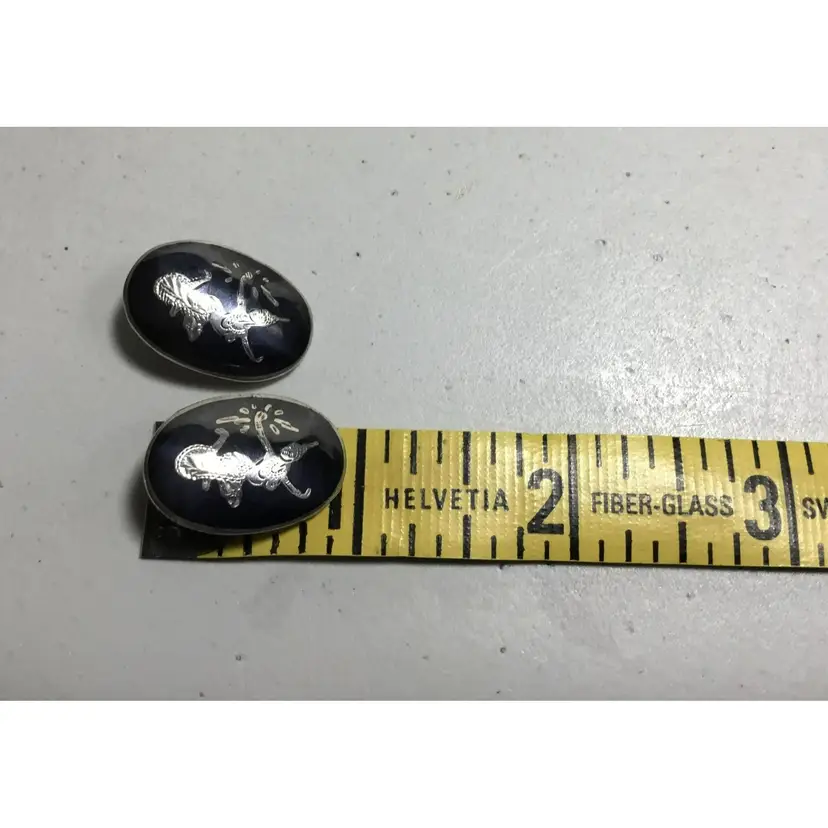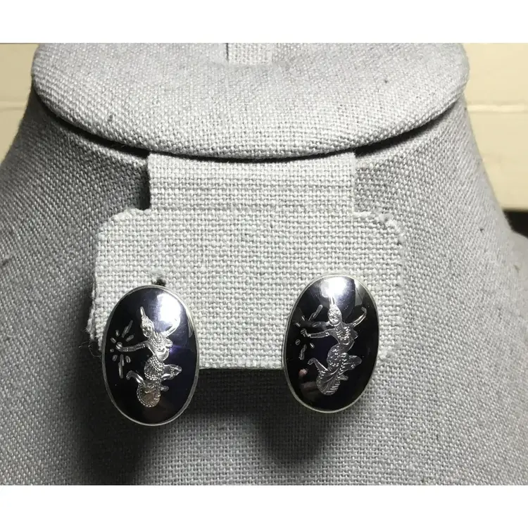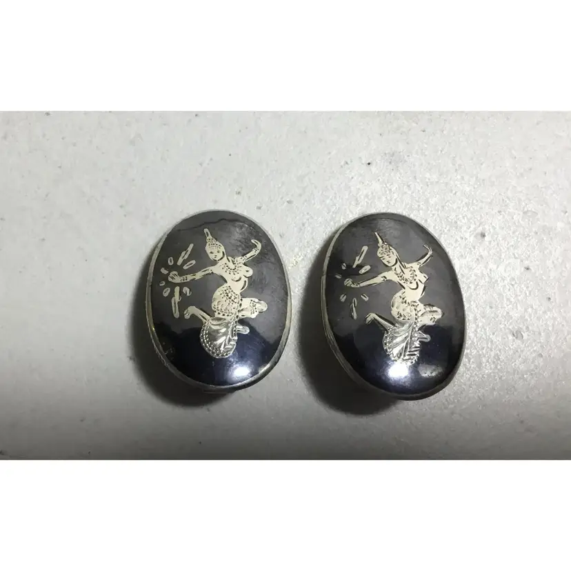Vintage, exotic Siam earrings made in Thailand, sterling silver throughout, with niello fill in. Niello is a mixture of metals (including silver) that act like enameling once they are fired in a kiln. These vintage clip-ons are shiny and not too heavy. 1 inch in length. Front of earrings feature Thai (ancient Siamese) temple-dancer women with flared skirt and something sparkly in one hand.