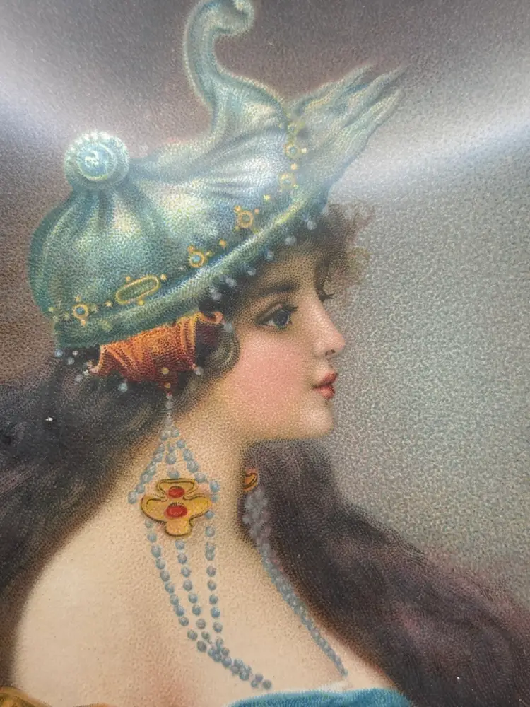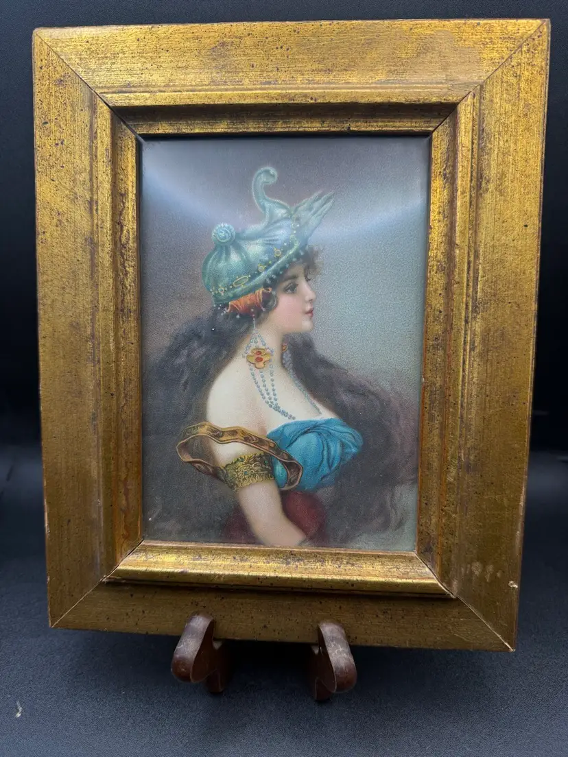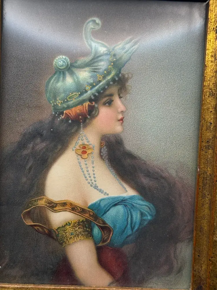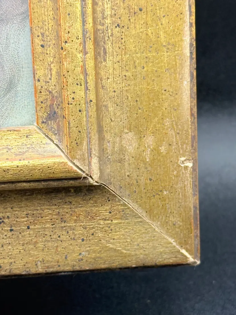 Beautiful French style print framed in a gold frame with glass. Frame has a couple of small dents ( see pics) glass might need inside cleaning 8x10