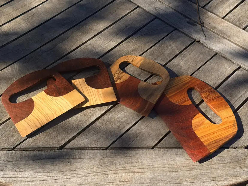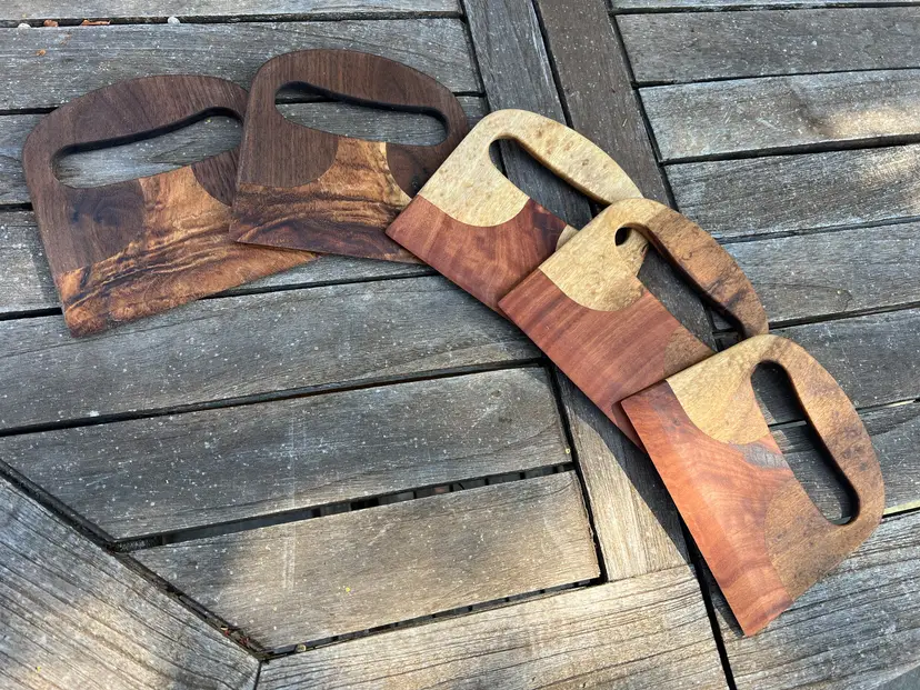 Bring a little extra joy and flair into your cooking or baking a unique bench scraper. The blades are made of woods like Olive, Bloodwood, or Red Iron Bark that can handle even the crustiest flour mess and yet are completely safe for any counter surface while the handles complement the rich colors and textures of the blades. Each is finished with pure tung oil, which takes more time to apply than mineral oil, but is much more durable. Inquire as to current stock or for a custom order.