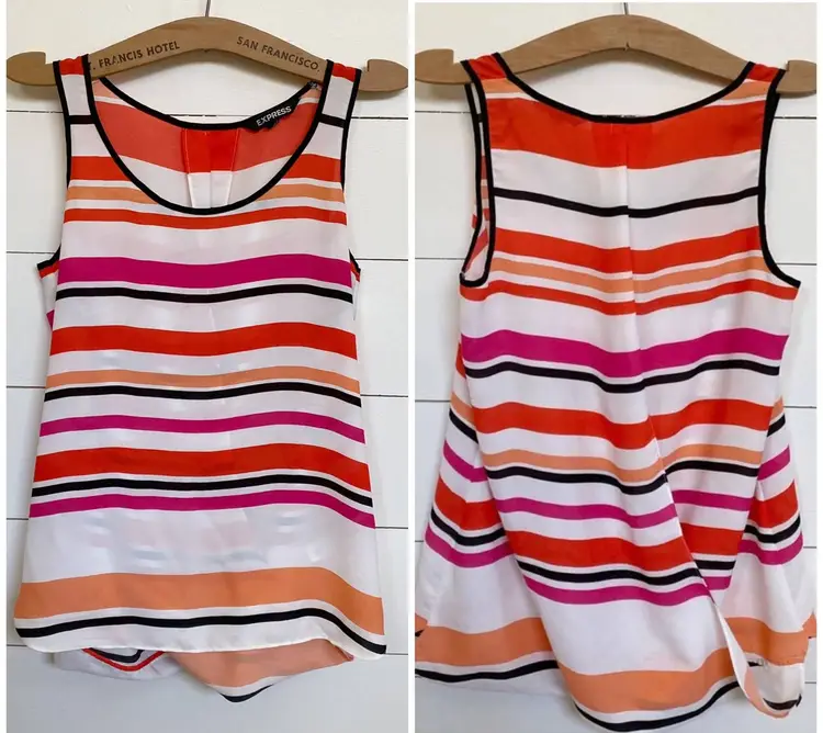 White striped tank in warm colors with black trim. Slit in middle back, Crossover twist design in back, drapes over and is sewn so that the drape tucks over and under. Scoop neck. neck, loose fit. Semi-sheer (undergarments may show through).