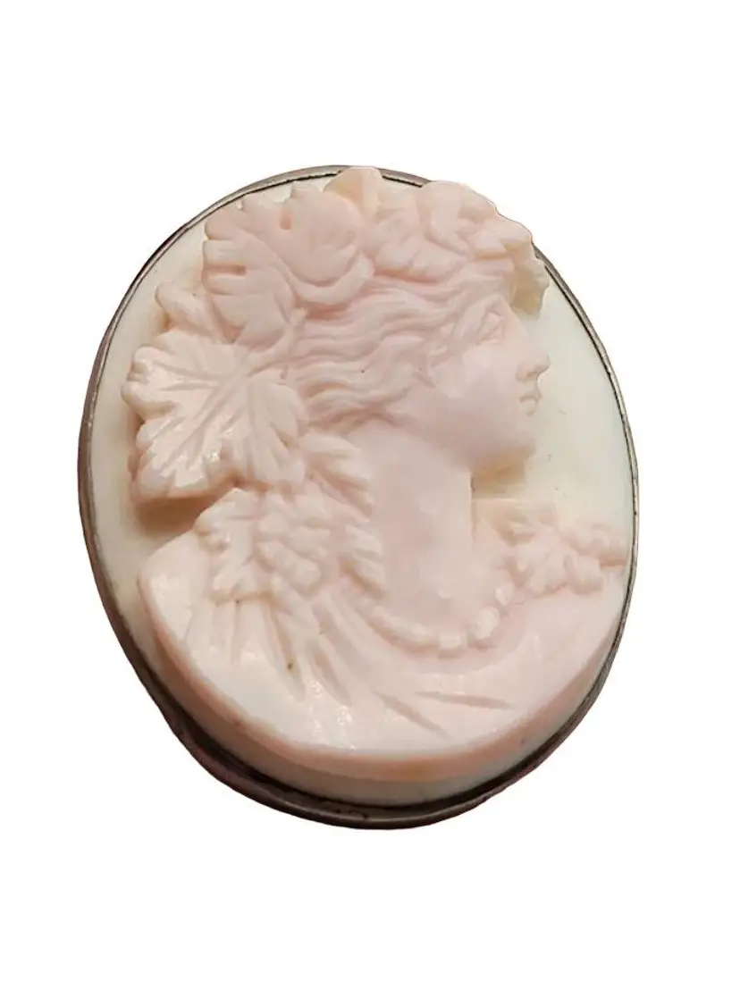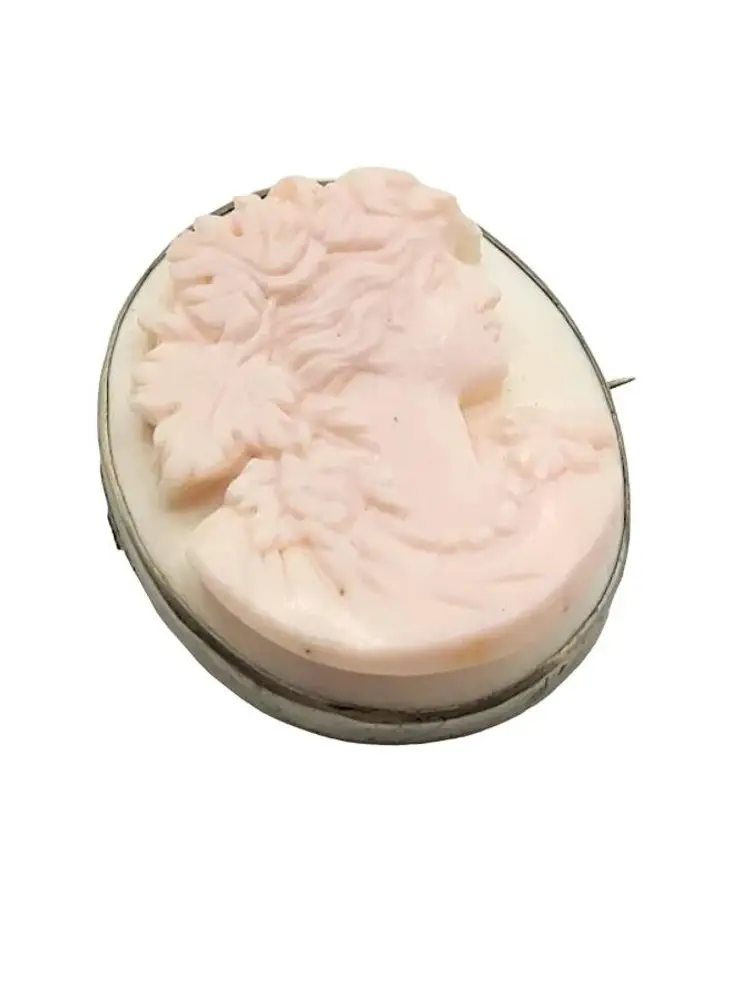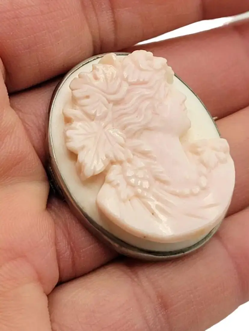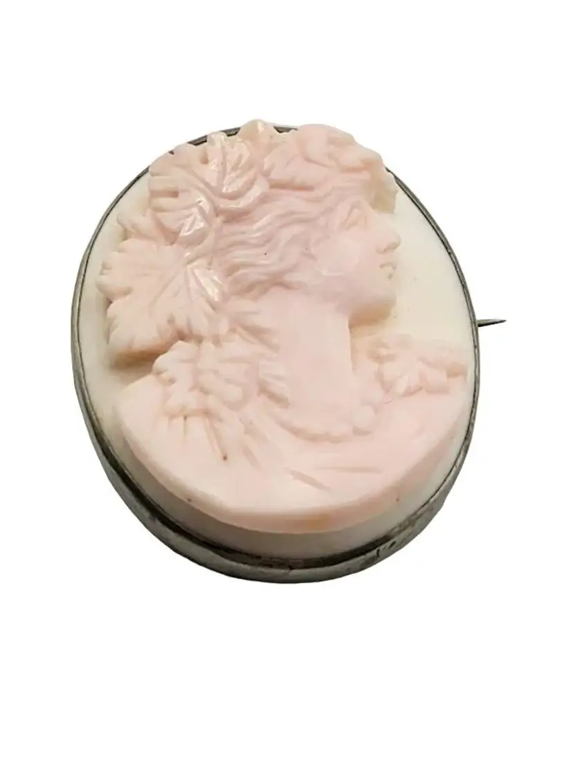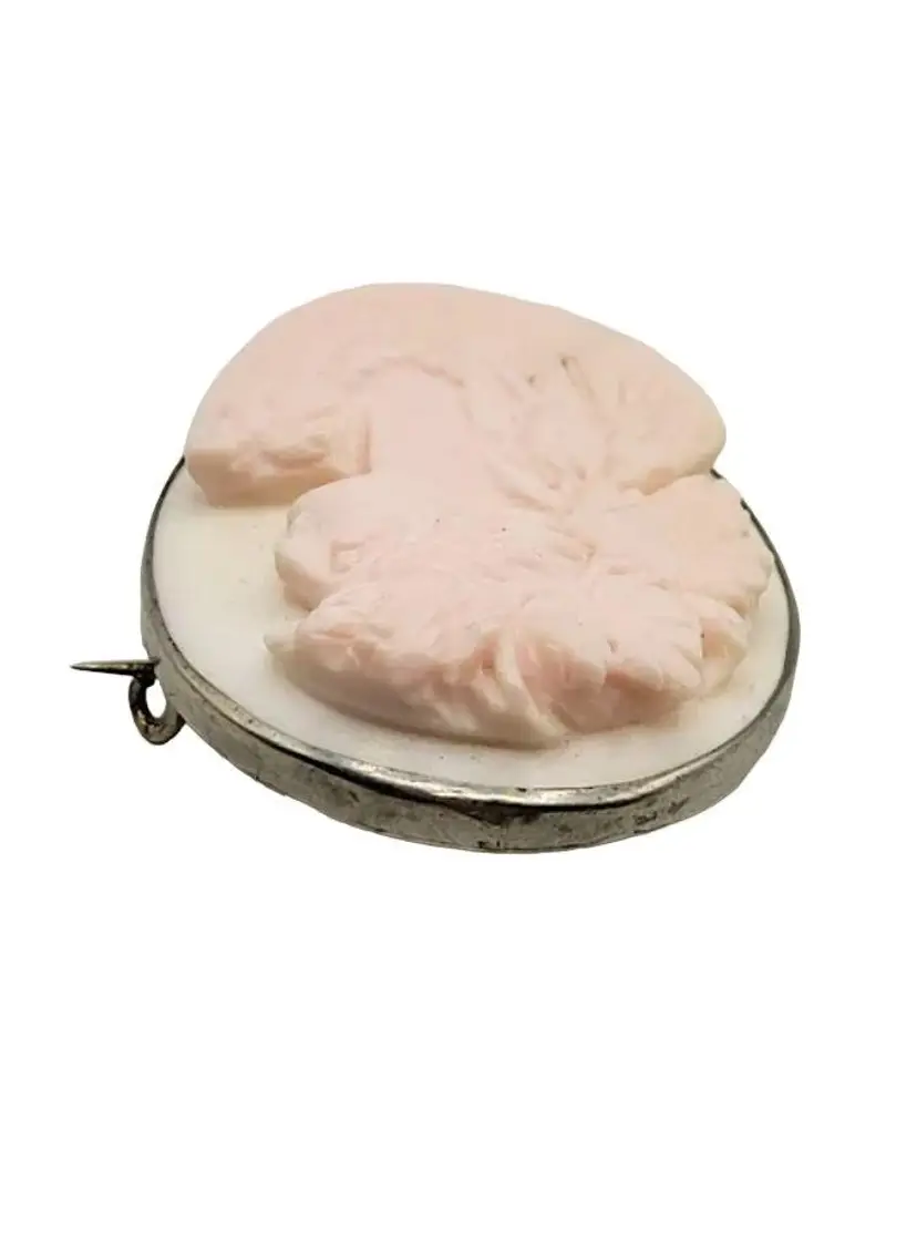 This is a magnificently carved cameo. I do believe this is made from a Caribbean conch shell, as it is a very light pink color. Highly detailed and in high relief. The metal frame is not marked and does not test as sterling. Possibly pewter or some type of base metal. Its 1.75". Absolutely stunning and unique piece