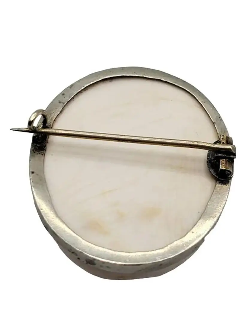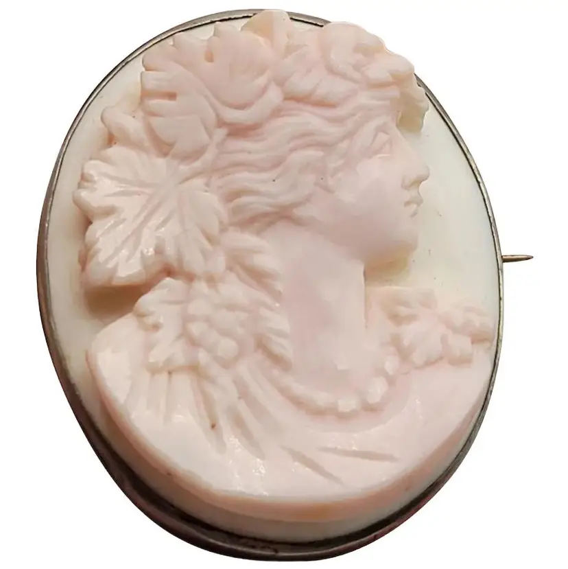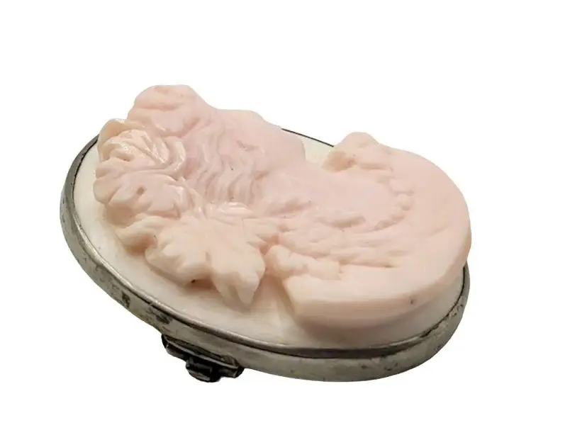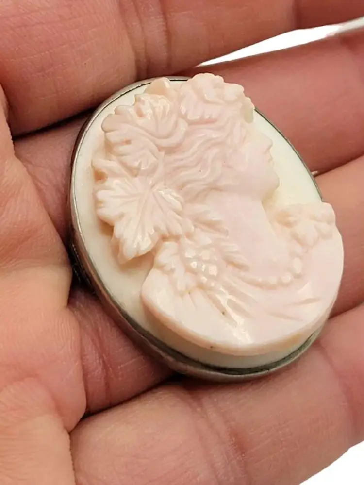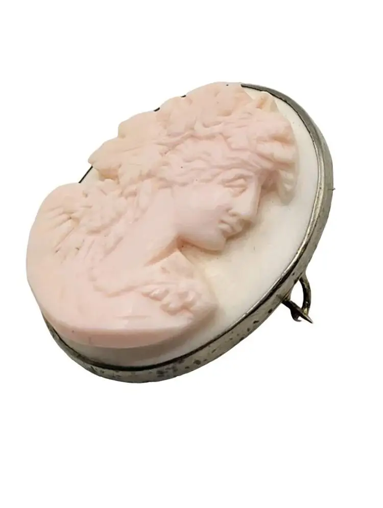This is a magnificently carved cameo. I do believe this is made from a Caribbean conch shell, as it is a very light pink color. Highly detailed and in high relief. The metal frame is not marked and does not test as sterling. Possibly pewter or some type of base metal. Its 1.75". Absolutely stunning and unique piece
