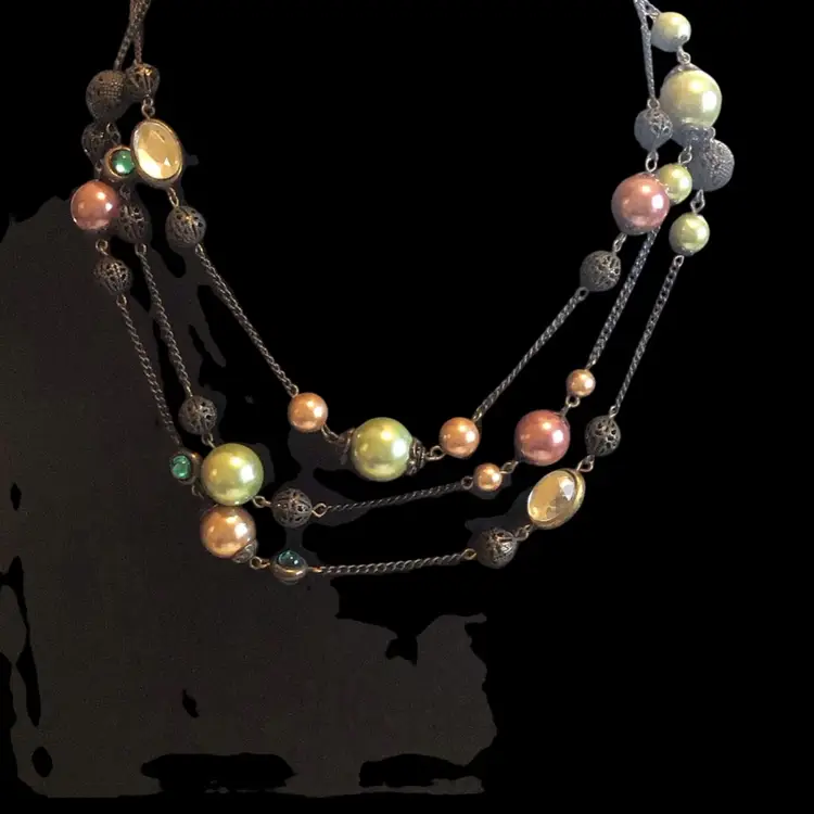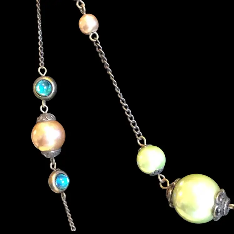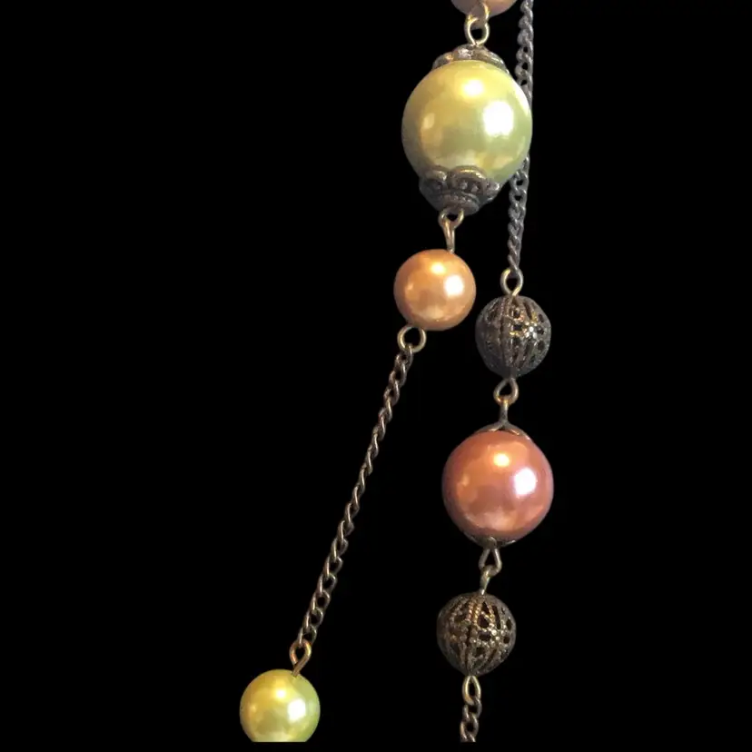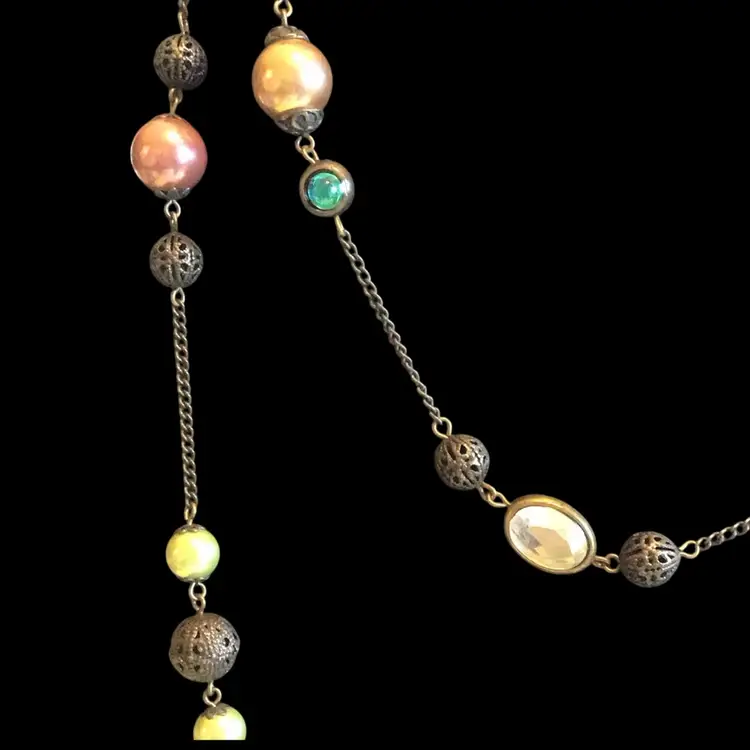 Faux pearls & gems with filigree bronze tone metal accents. 60” long. #740