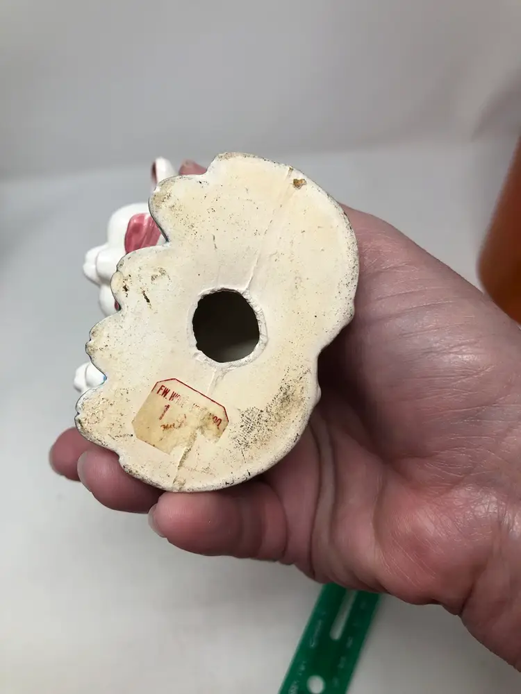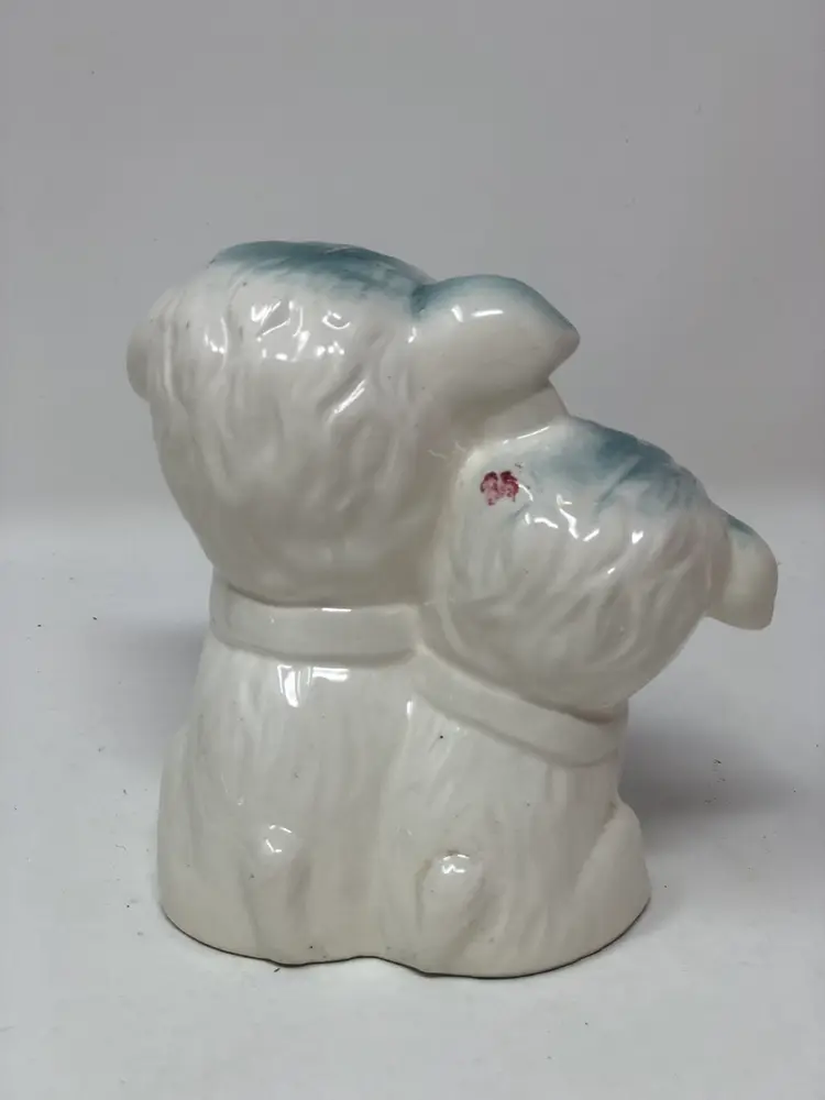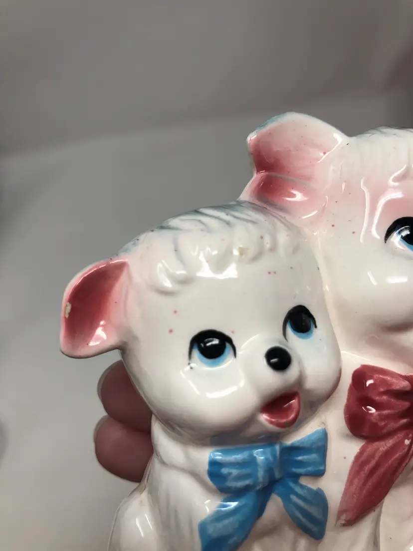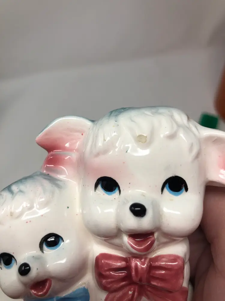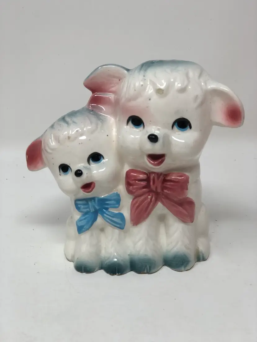 Pair of sweet lambs wearing bows 4" high. Some wear around the base, otherwise good vintage condition. Partial original tag.
