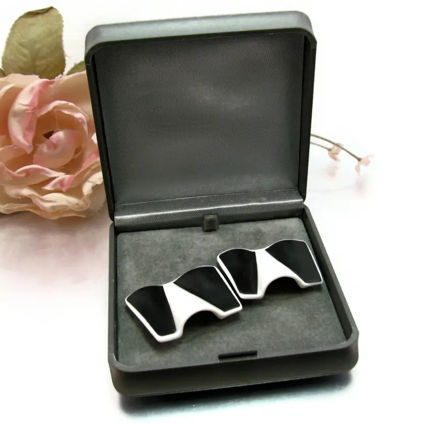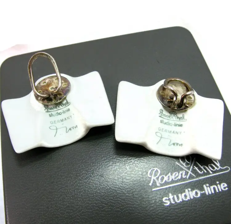This wonderful vintage pair of porcelain clip on earrings were designed by Johan Van Loon and produced by Rosenthal Germany and feature a mid-century design in black and white. The earrings come in original box which has minor wear.