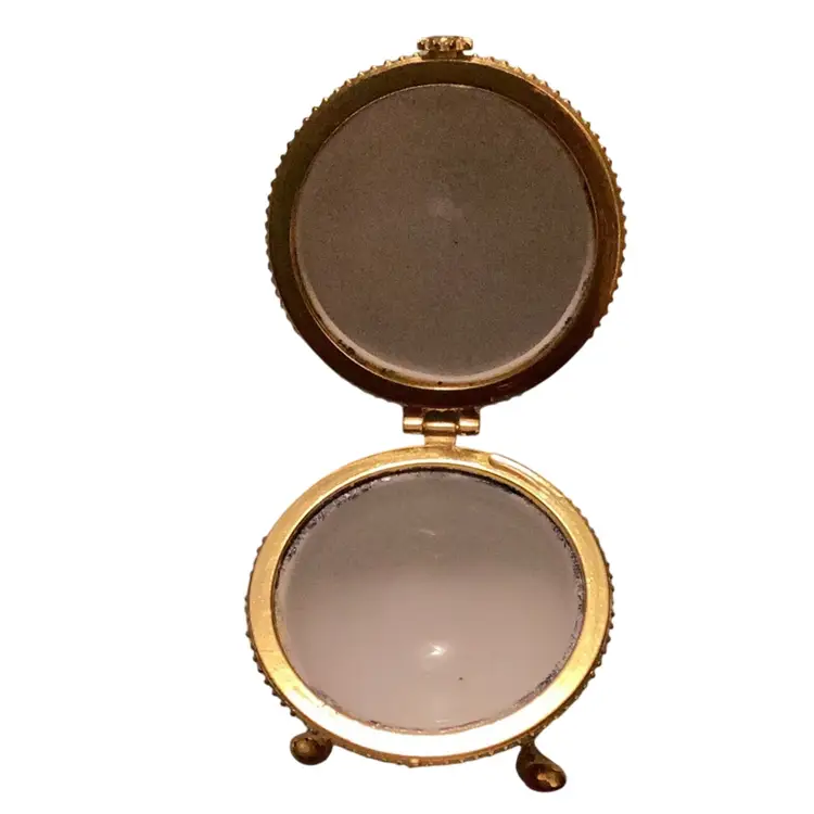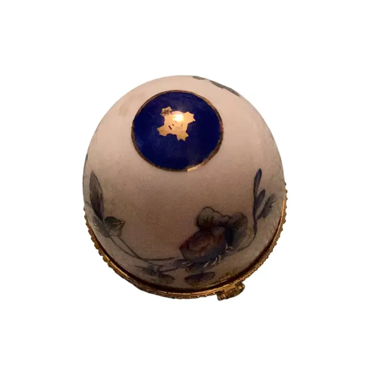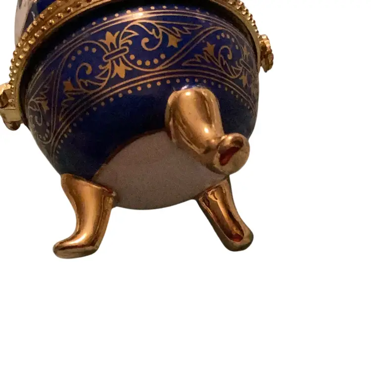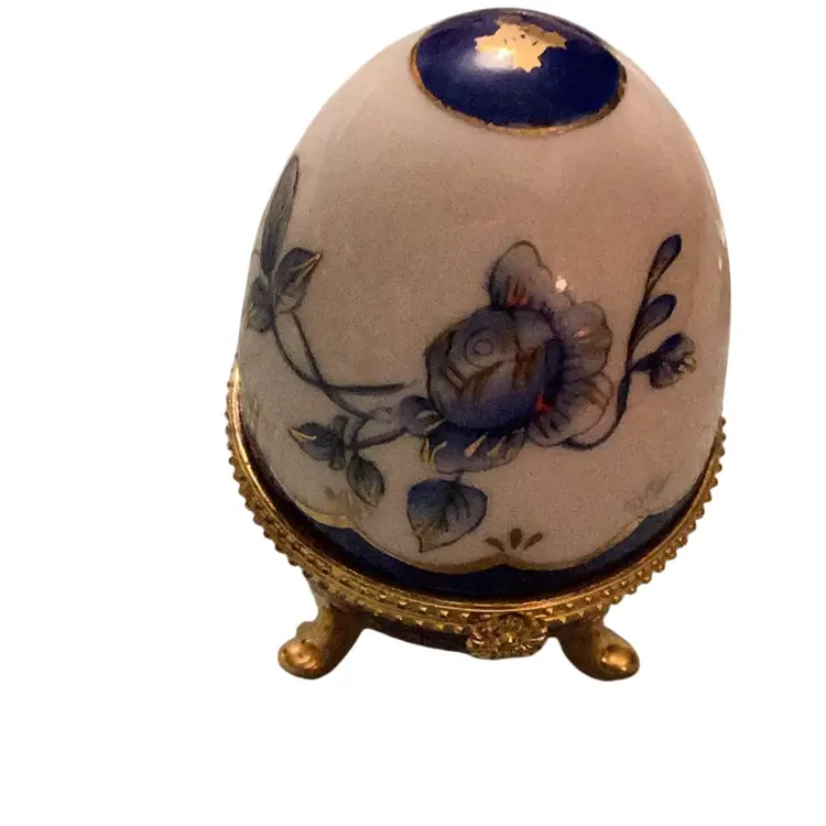 Egg shaped trinket box with three legs. The colors are blue with white and gold accent floral pattern. The hinge is in excellent condition and has a tight clothes. This measures approximately 4 inches tall it has no cracks or chips. Pre owned