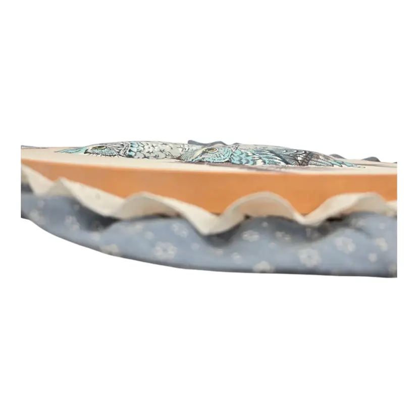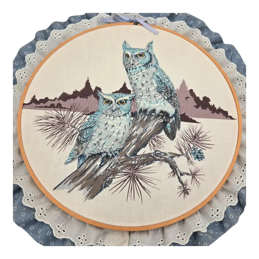 Fabric on embroidery ring. Owls are 3D. No issues noted
