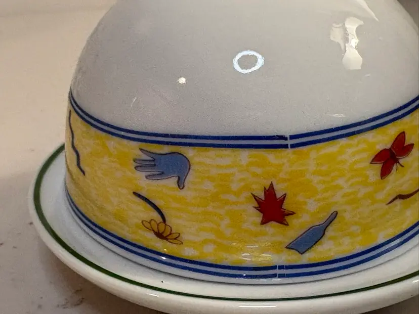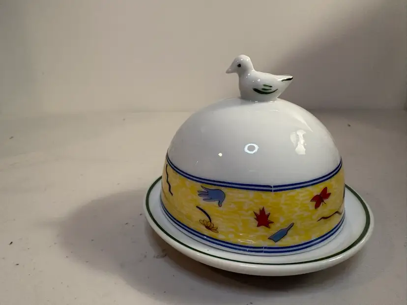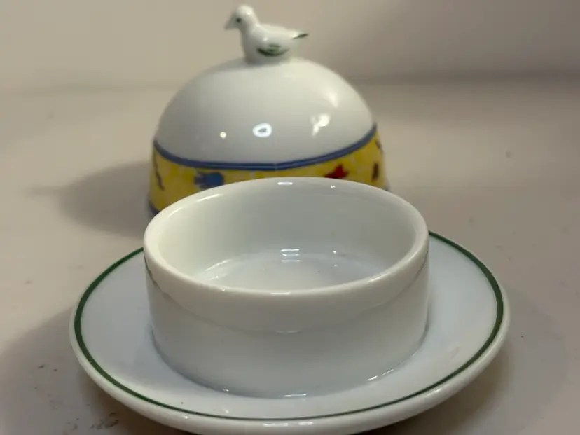 The Fabriquee et Decoree a Limoges France Goose Duck Butter Dish is a charming addition to any kitchen or dining room. Made in France by Limoges, this unique butter dish features a whimsical design of a goose or duck, adding a touch of country charm to your table setting. Perfect for storing and serving butter, this Limoges piece is a collectible item that showcases the traditional craftsmanship of French dinnerware.