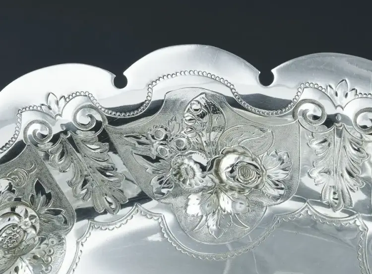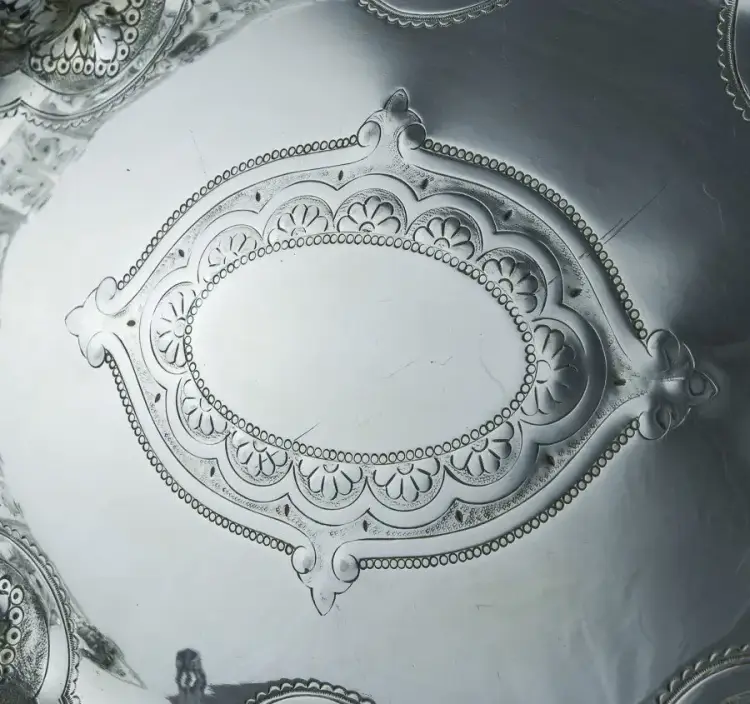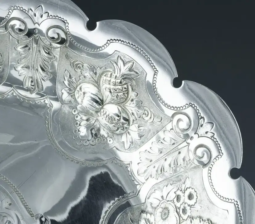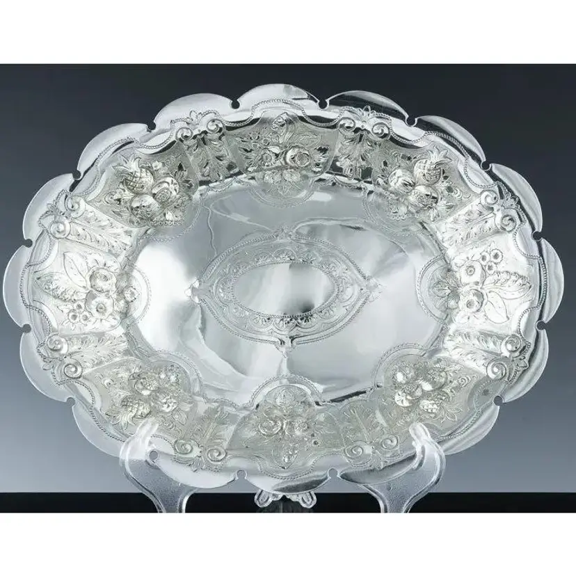 Presented for your consideration is a Fabulous c1890 Victorian Fruit and Flower Repousse Silver Plate Centerpiece Serving Bowl. This is a very fine example, being made by Latham & Morton of Birmingham. Superb bright silver plate and very clean through. With very detailed Repousse designs as seen,i have never seen another bowl with the fruit and flower pattern that was not in Sterling Silver. also features fine Bright Cut designs to the center. Great larger size for use as a centerpiece filled with fruit, gourds, Christmas Balls etc depending on time of year. A very fine piece, one your will love for many years to come.