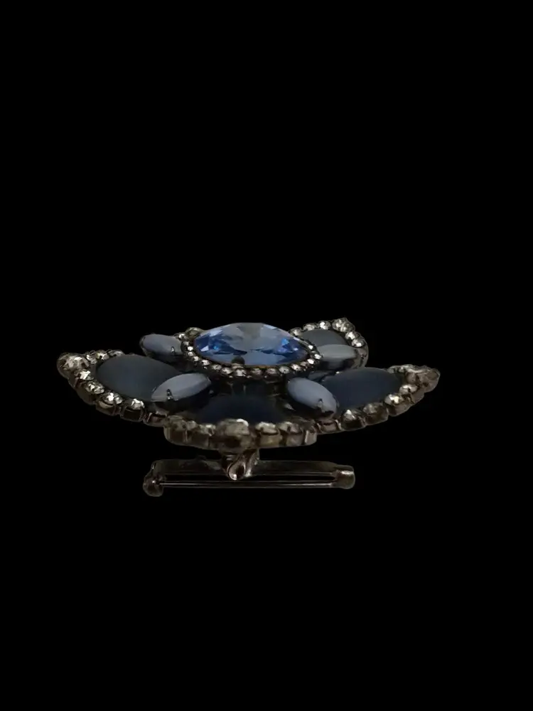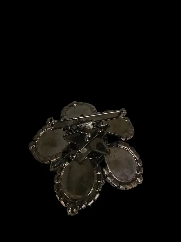 Details: Comes from a collector, signed on the back. Frosted glass cabochons and a stunning, highly faceted glass stone center. Gunmetal back.