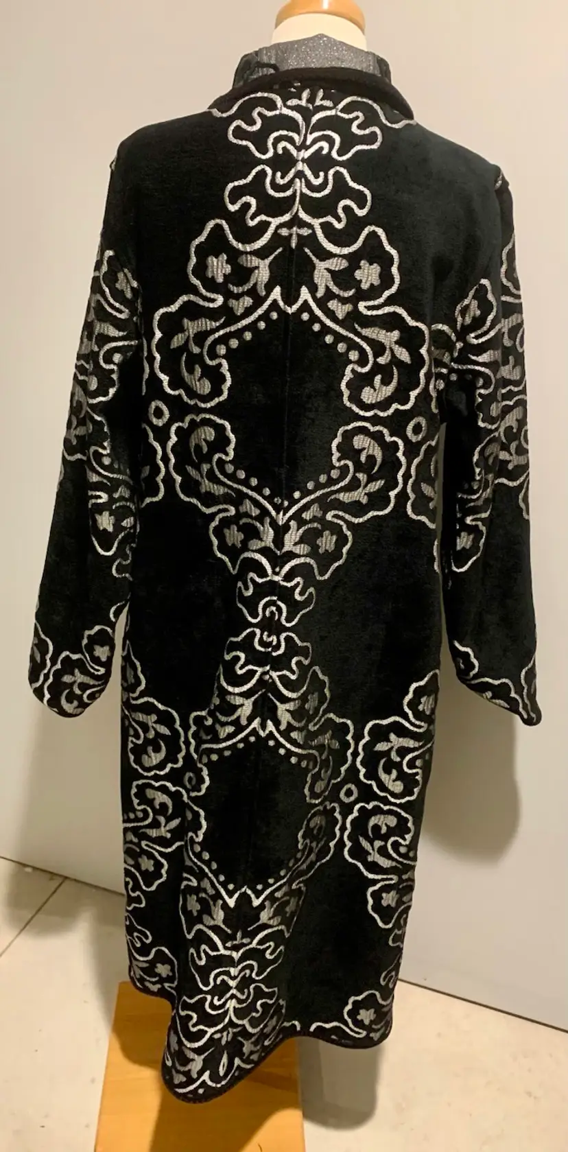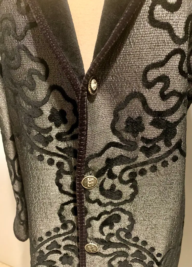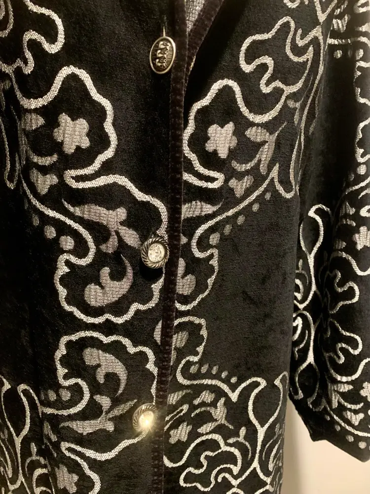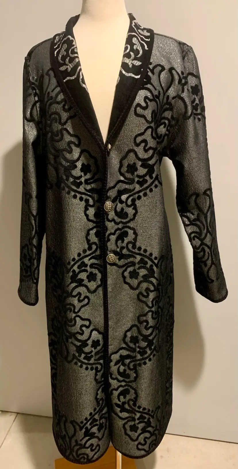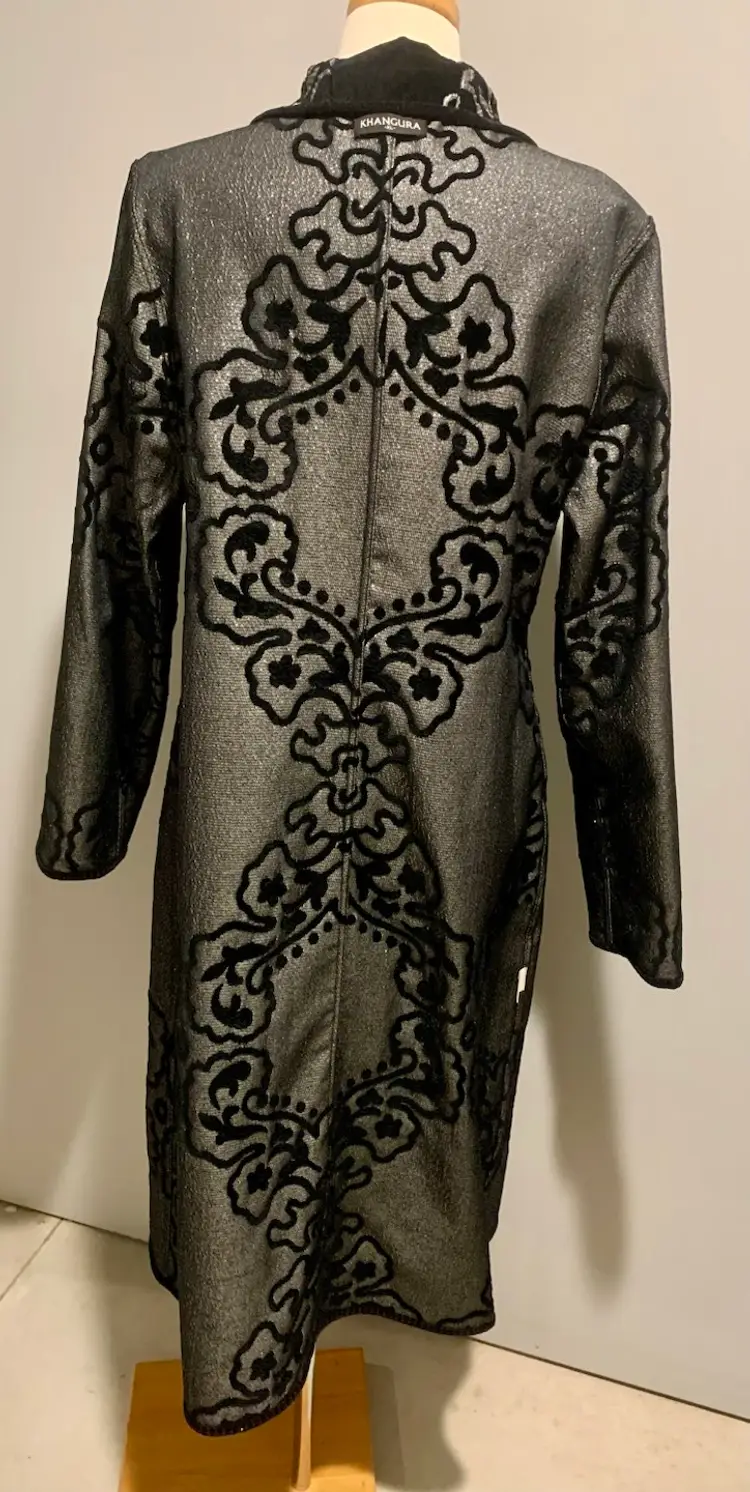 Khangura: Statement Piece! Women's vintage style, reversible coat black & silver. Ornate buttons. New. 63% Viscose, 37% Poly. Dry Clean only. Smoke free Measurements taken across flat garment Size XL: Shoulders 17.5", Bust/Waist 21.5", Length 45", Sleeve 25.5" *All Sales Final