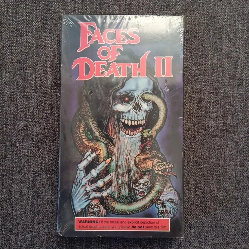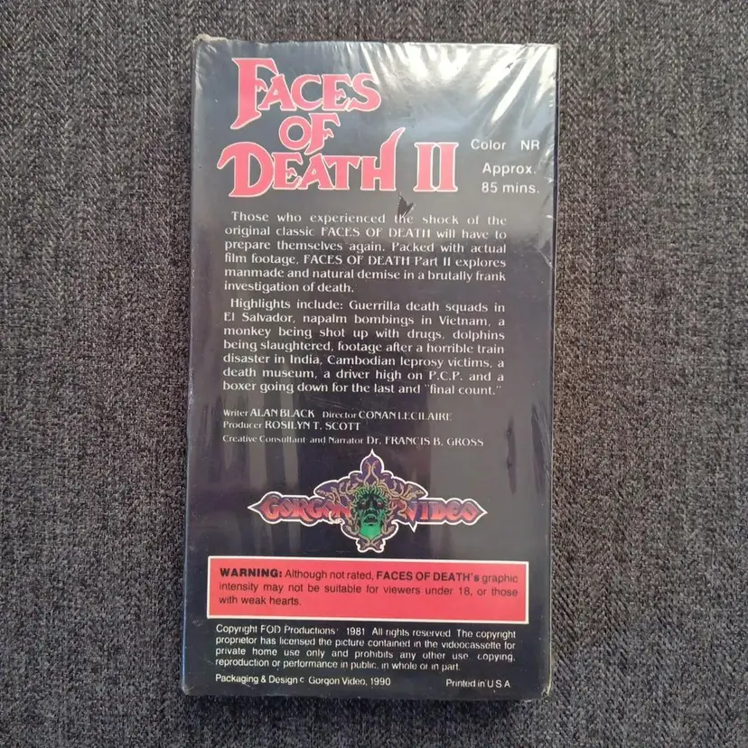 This is a sealed VHS of the 1990 release of the cult movie Faces of Death 2. There's a couple of tears in the plastic but the VHS has never been opened or used. This film continues along the same lines as F.O.D. 1 with short scenes of material related to death. Mortuaries, accidents, and police work are filmed by television equipment and domestic video cameras.