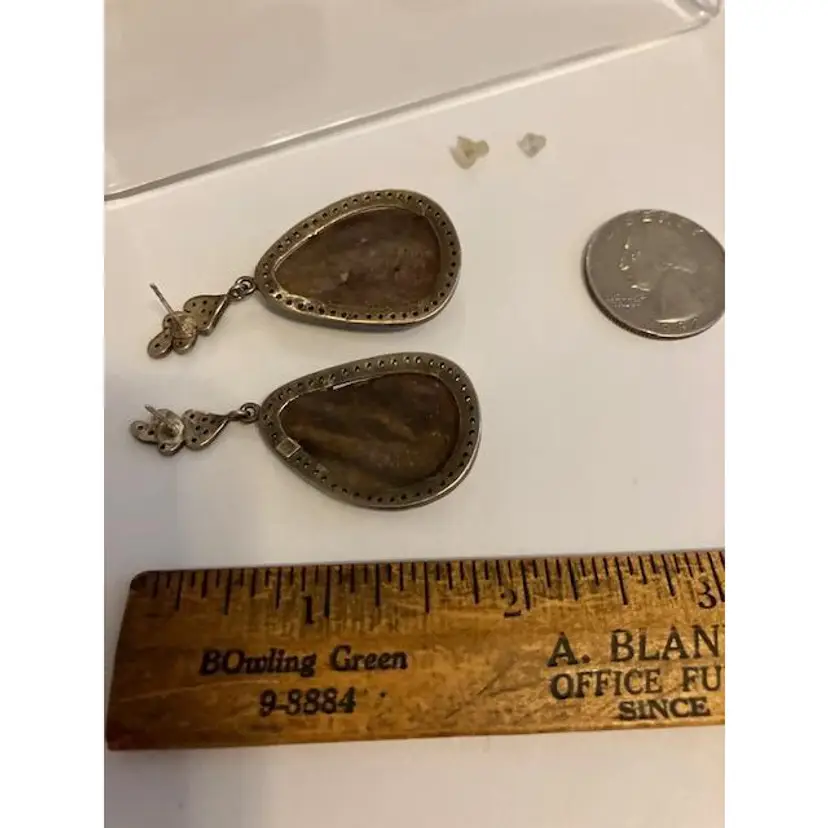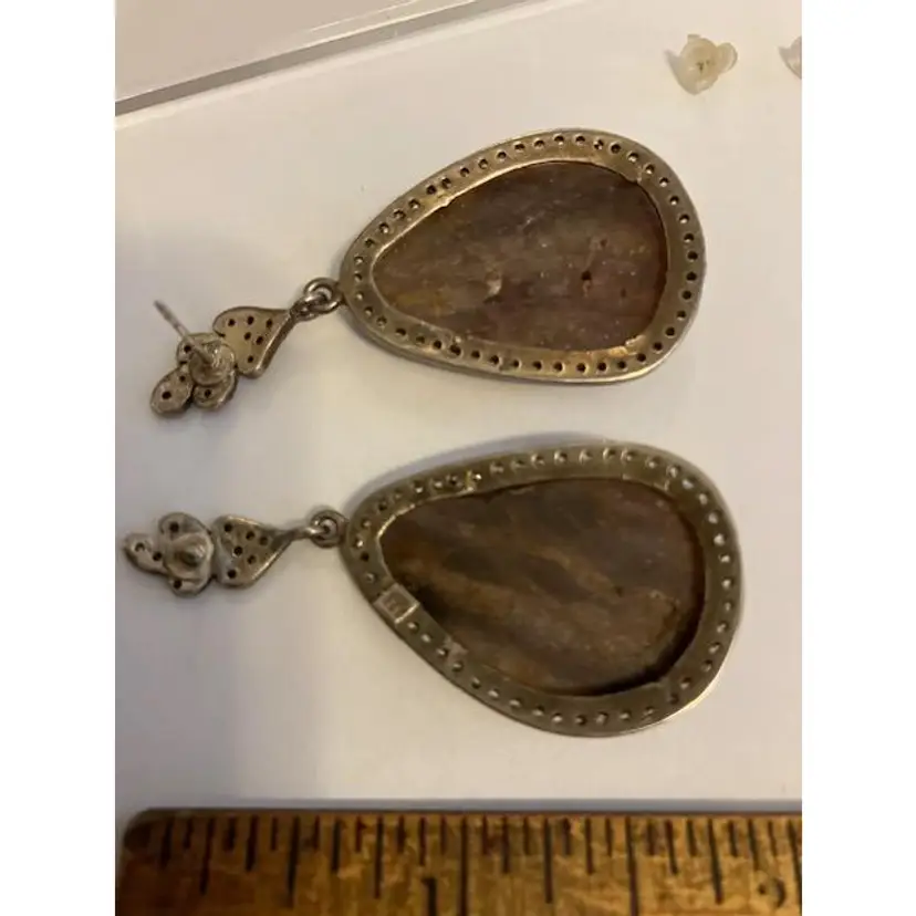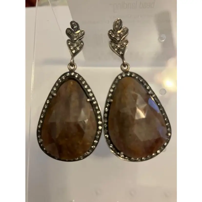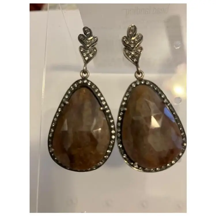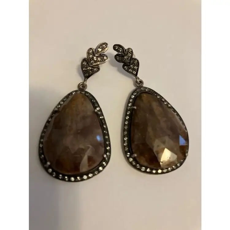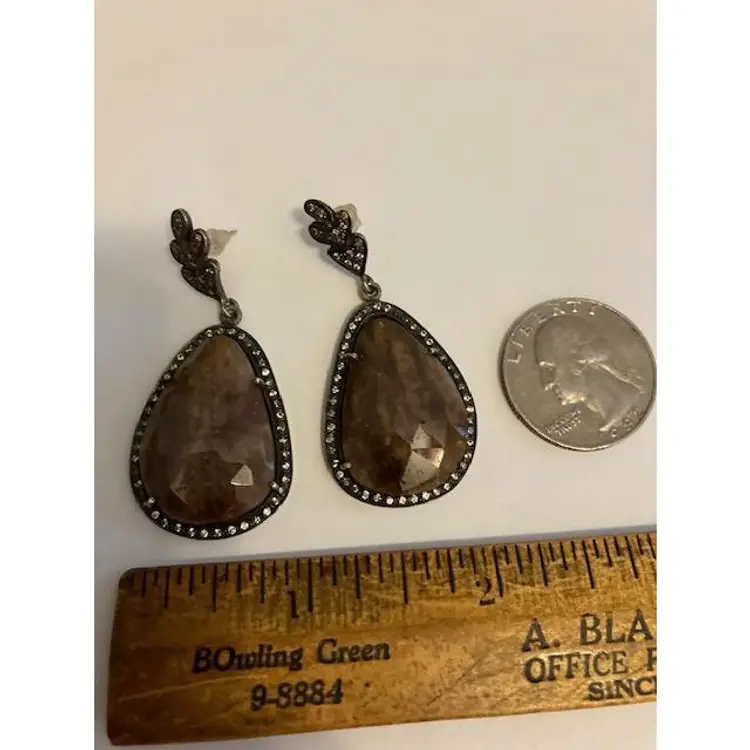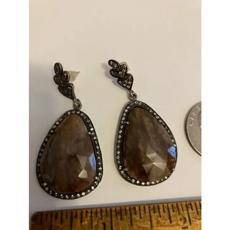 Sterling silver hardware with lovely prong set faceted brown stone, marcasite and pave rhinestone pierced drop earrings. One earring is stamped 925. Pear shaped sapphires measure 1 1/4" x 1" with a 2" hang length. Really pretty in person. The sapphires reflect light well and are shiny and sparkly.