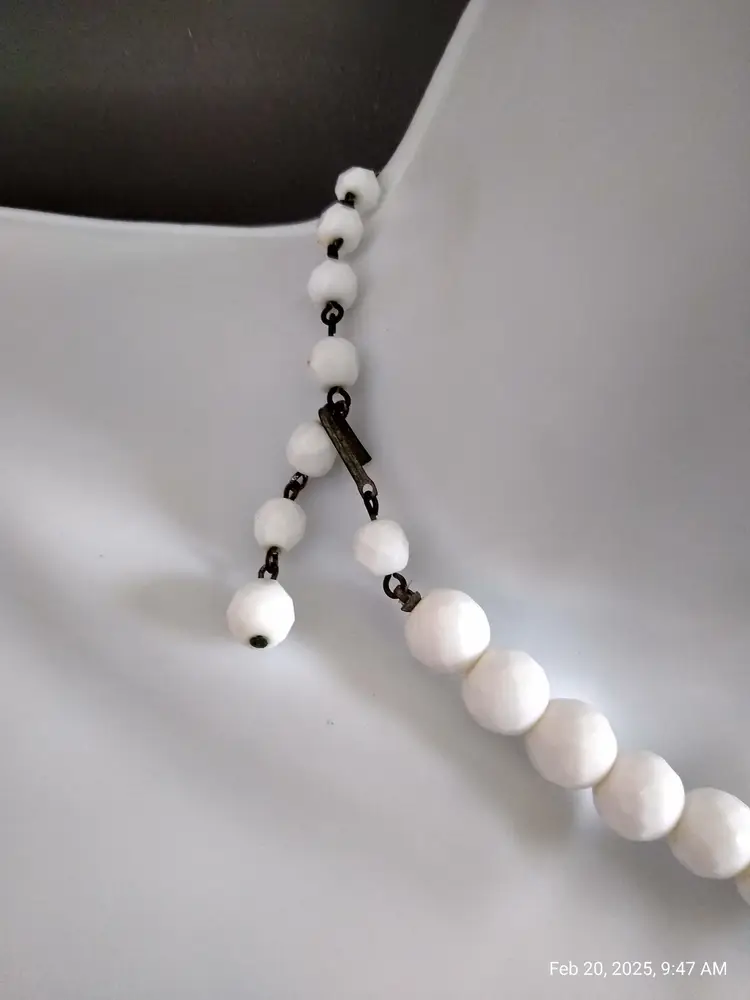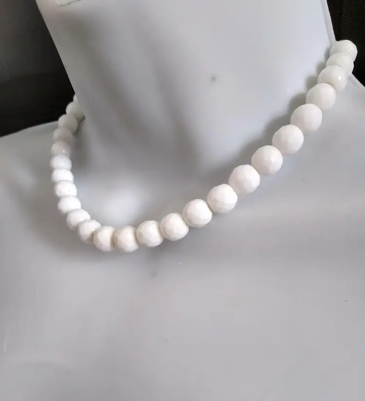 Simple and elegant, this vintage choker features faceted milk glass white beads.