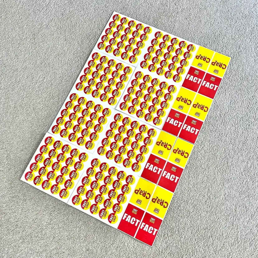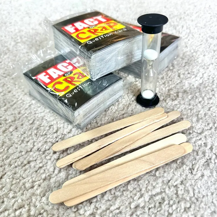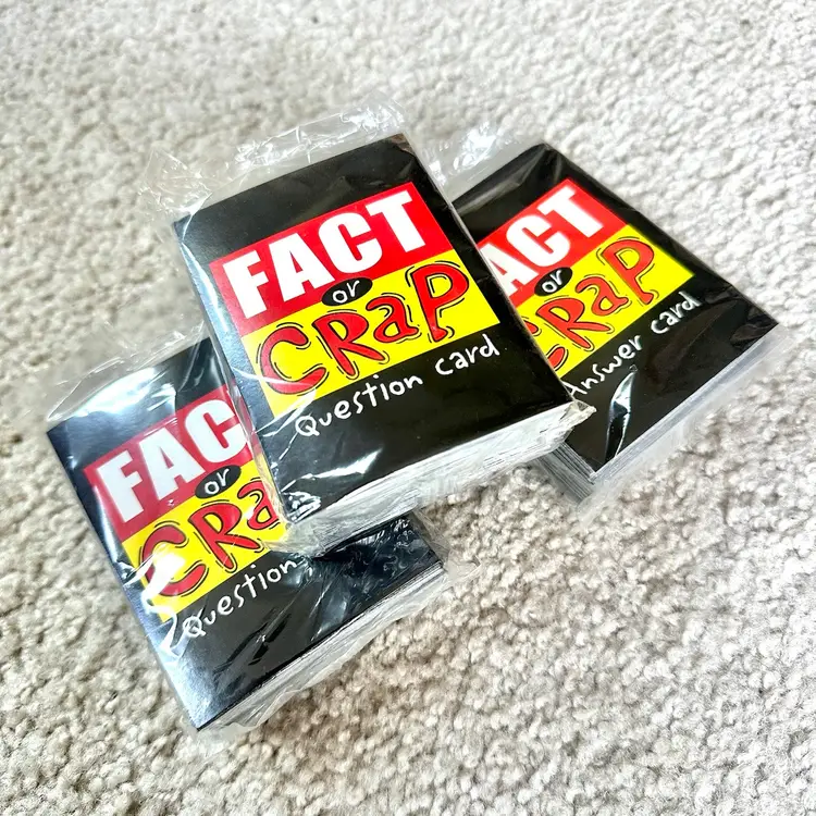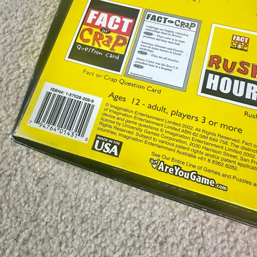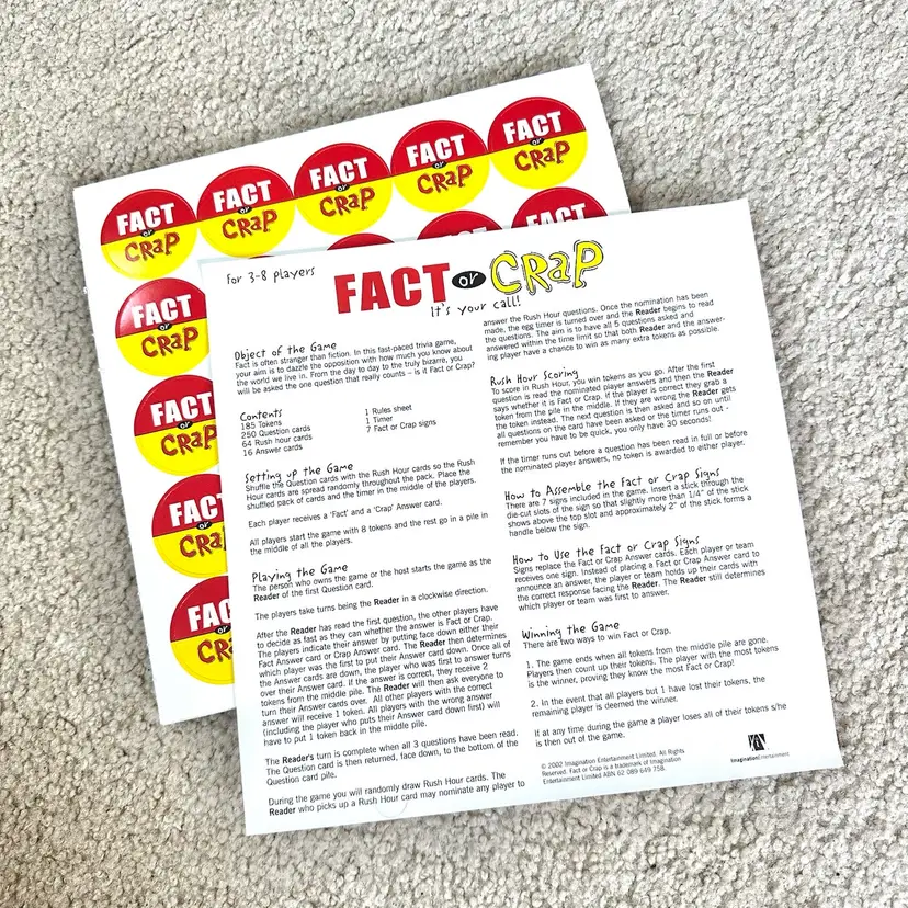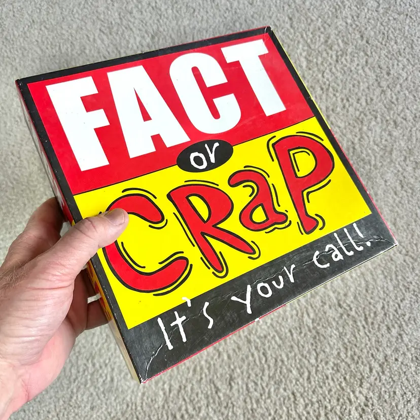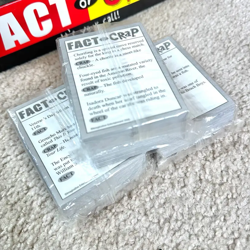 Original 2002 first edition of the FACT OR CRAP trivia game made by Imagination Entertainment in USA. Game is complete and the contents are unused. Hard question and answer card still in their original clear plastic wrap. Tokens, hand signs and sign sticks all unused. Timer and Instructions sheet look perfect. Box has very minor shelf wear from storage. See pics for more details.