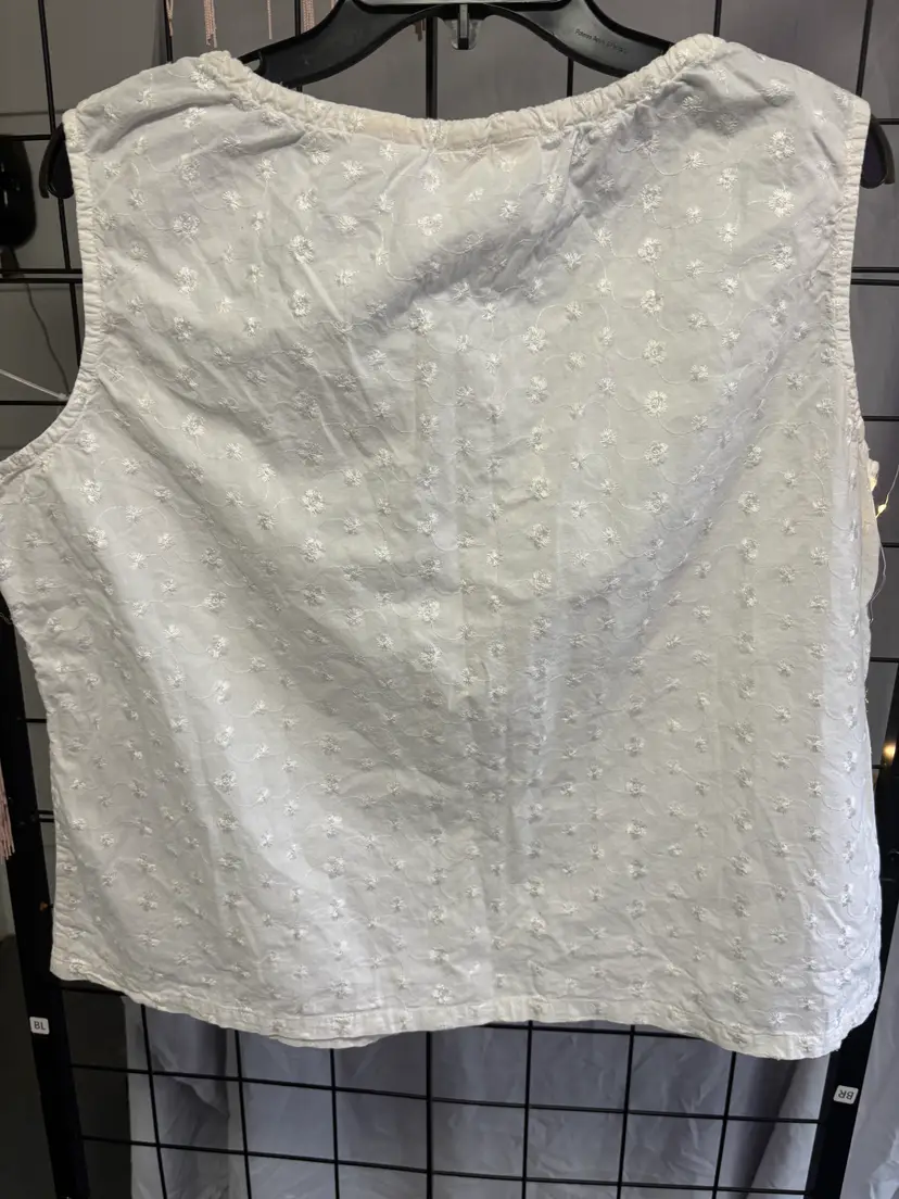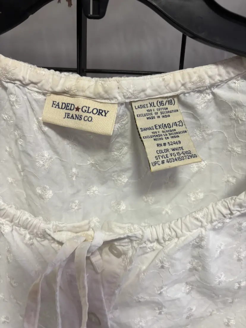 Button up white with tie neckline peasant top. XL perfect for summer. 16/18. Pit to pit 23" & 22" L. 100% cotton.