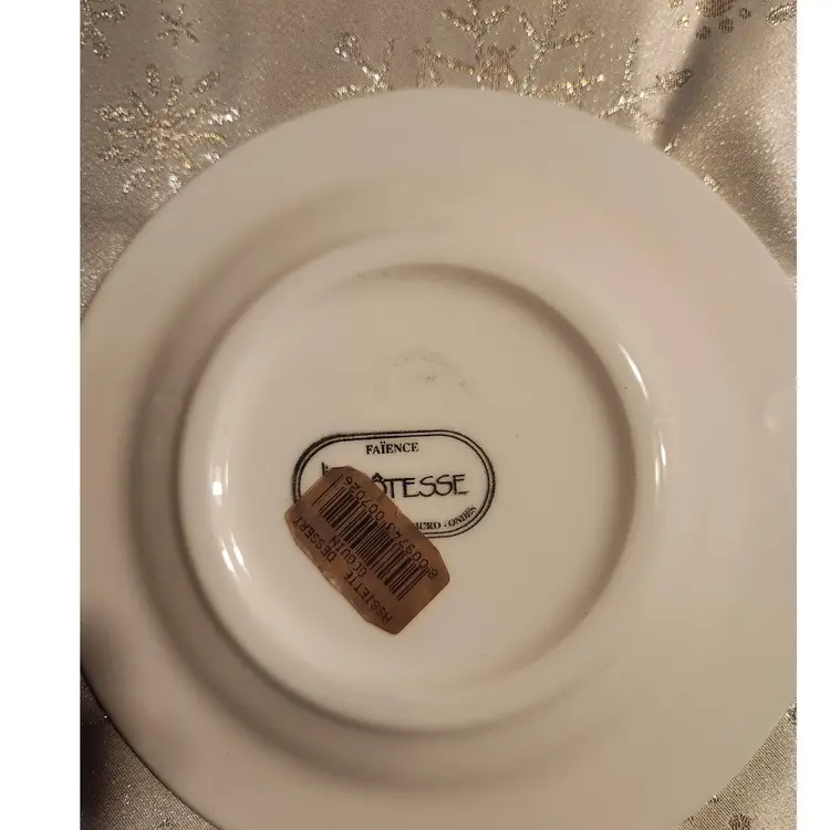 Faience Ligne Hotesse Fruit Decor Dessert Plate 1980s? Measure 8 1/4 inches There are 3 small bumps ( manufacture defect?) on back of plate Otherwise in excellent condition - no chips or cracks